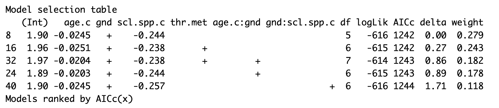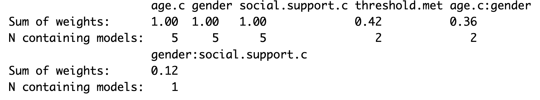 All five of the best models contain age, gender and social.support (variable importance weights of 1); two of them contain income threshold.met (variable importance weight 0.42). There is some support for gender modifying the effects of age (2 models, variable importance 0.36), and a little for gender modifying the effect of social support (one model, 0.12).