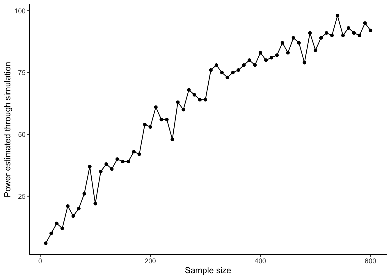 On this graph, there is some noise in the power-sample size relationship. This is due to the fact that we only ran 100 simulations at each sample size. If you wanted to smooth this, you could run 1000 simulations at each sample size. This would give you much more precise estimates and a smoother curve, but it would take ten times as long to run.