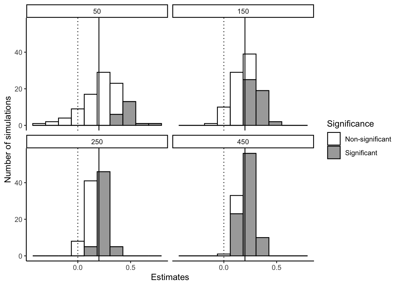 Why does power increase as sample size increases? We can investigate by looking at the histogram of the parameter estimates from a hundred simulations with different sample sizes, coloured by whether they were significant or not. Again, the comments help you see what the code is doing.