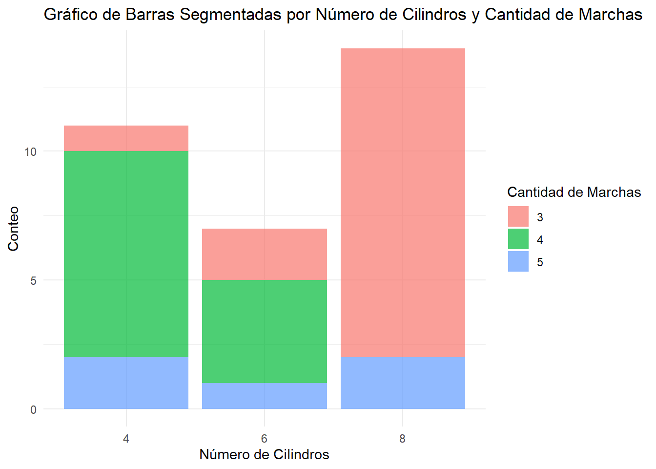 # Gráfico de barras segmentadas con el conjunto de datos mtcarsggplot(mtcars, aes(x =factor(cyl), fill =factor(gear))) +geom_bar(position ="stack", alpha =0.7) +labs(title ="Gráfico de Barras Segmentadas por Número de Cilindros y Cantidad de Marchas",x ="Número de Cilindros",y ="Conteo",fill ="Cantidad de Marchas") +theme_minimal()