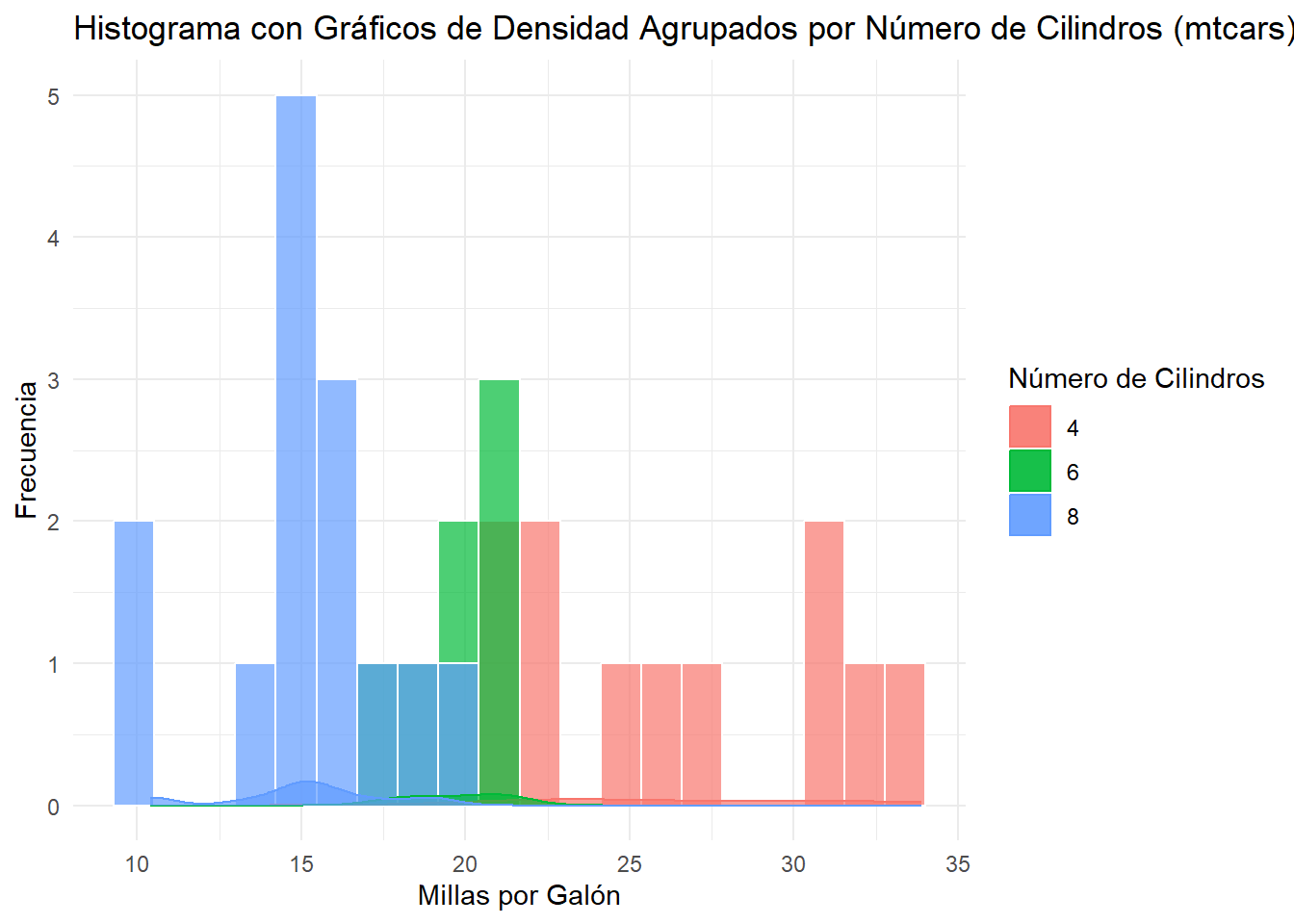 # Instalar y cargar la librería ggplot2 si aún no lo has hecho# install.packages("ggplot2")library(ggplot2)# Crear un histograma con gráficos de densidad agrupados para mpg en mtcarsggplot(mtcars, aes(x = mpg, fill =factor(cyl))) +geom_histogram(alpha =0.7, position ="identity", bins =20, color ="white", width =2) +geom_density(aes(y = ..count.. *0.05, color =factor(cyl)), alpha =0.7) +labs(title ="Histograma con Gráficos de Densidad Agrupados por Número de Cilindros (mtcars)",x ="Millas por Galón",y ="Frecuencia",fill ="Número de Cilindros",color ="Número de Cilindros") +theme_minimal()
