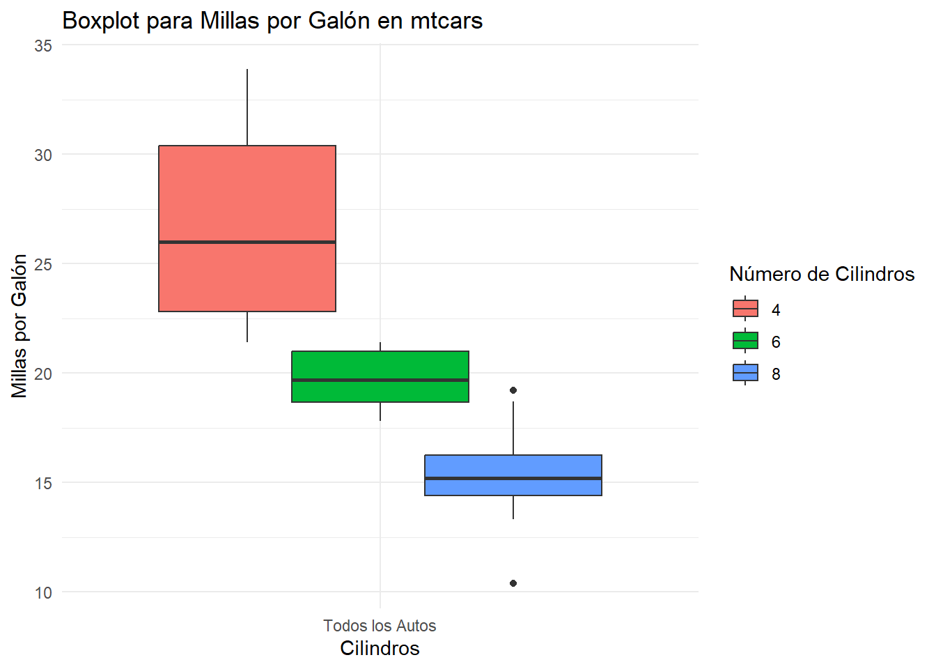 # Gráfico (Boxplot) para millas por galón en mtcarsggplot(mtcars, aes(x ="Todos los Autos", y = mpg, fill =factor(cyl))) +geom_boxplot(width =1, position =position_dodge(width =0.75)) +labs(title ="Boxplot para Millas por Galón en mtcars",x ="Cilindros",y ="Millas por Galón",fill ="Número de Cilindros") +theme_minimal()