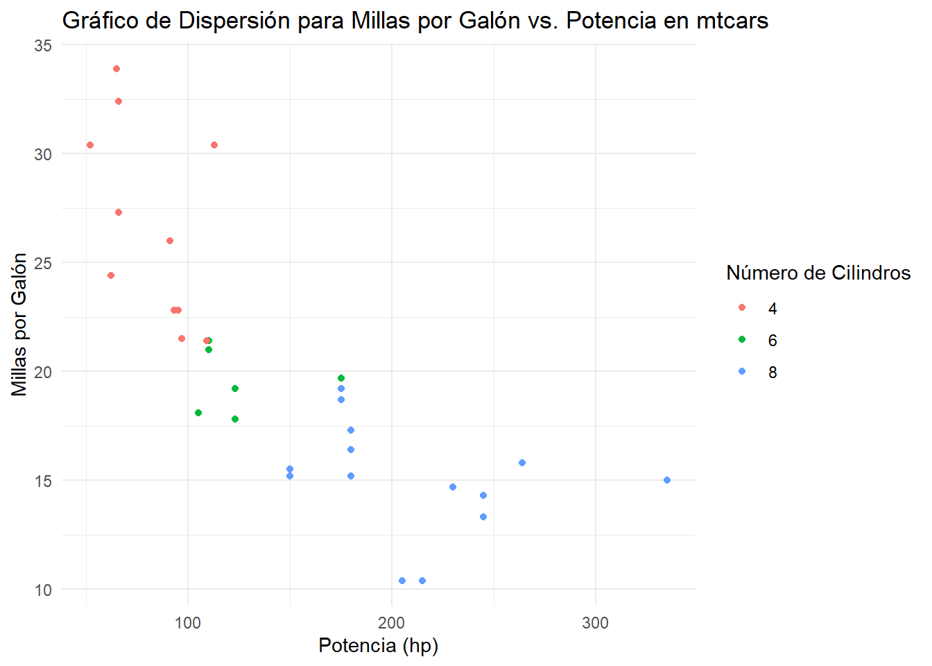 # Gráfico de dispersión para mpg vs. hp en mtcarsggplot(mtcars, aes(x = hp, y = mpg, color =factor(cyl))) +geom_point() +labs(title ="Gráfico de Dispersión para Millas por Galón vs. Potencia en mtcars",x ="Potencia (hp)",y ="Millas por Galón",color ="Número de Cilindros") +theme_minimal()