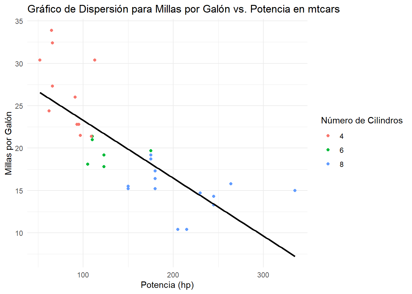 ggplot(mtcars, aes(x = hp, y = mpg, color =factor(cyl))) +geom_point() +geom_smooth(method ="lm", se =FALSE, color ="black", formula = y ~ x) +labs(title ="Gráfico de Dispersión para Millas por Galón vs. Potencia en mtcars",x ="Potencia (hp)",y ="Millas por Galón",color ="Número de Cilindros") +theme_minimal()