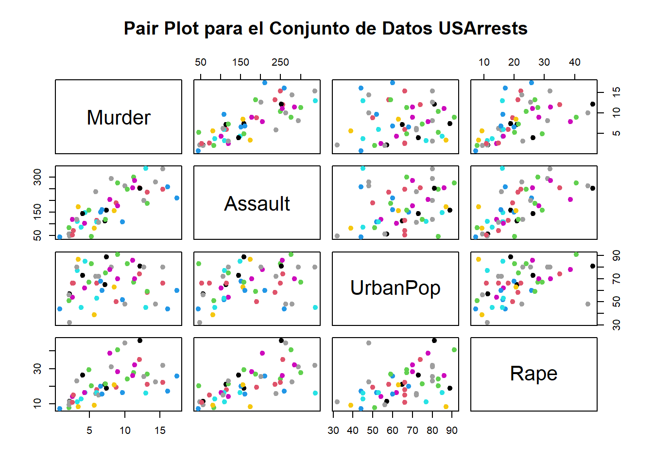 # Crear un gráfico de pares con el conjunto de datos USArrestspairs(USArrests, pch =19, col =as.integer(USArrests$UrbanPop), main ="Pair Plot para el Conjunto de Datos USArrests")