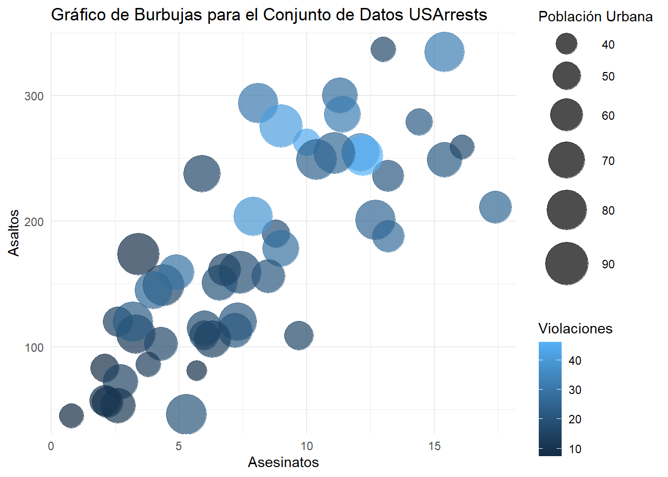 # Gráfico de burbujas con el conjunto de datos USArrestsggplot(USArrests, aes(x = Murder, y = Assault, size = UrbanPop, color = Rape)) +geom_point(alpha =0.7) +scale_size_continuous(range =c(3, 15)) +labs(title ="Gráfico de Burbujas para el Conjunto de Datos USArrests",x ="Asesinatos",y ="Asaltos",size ="Población Urbana",color ="Violaciones") +theme_minimal()