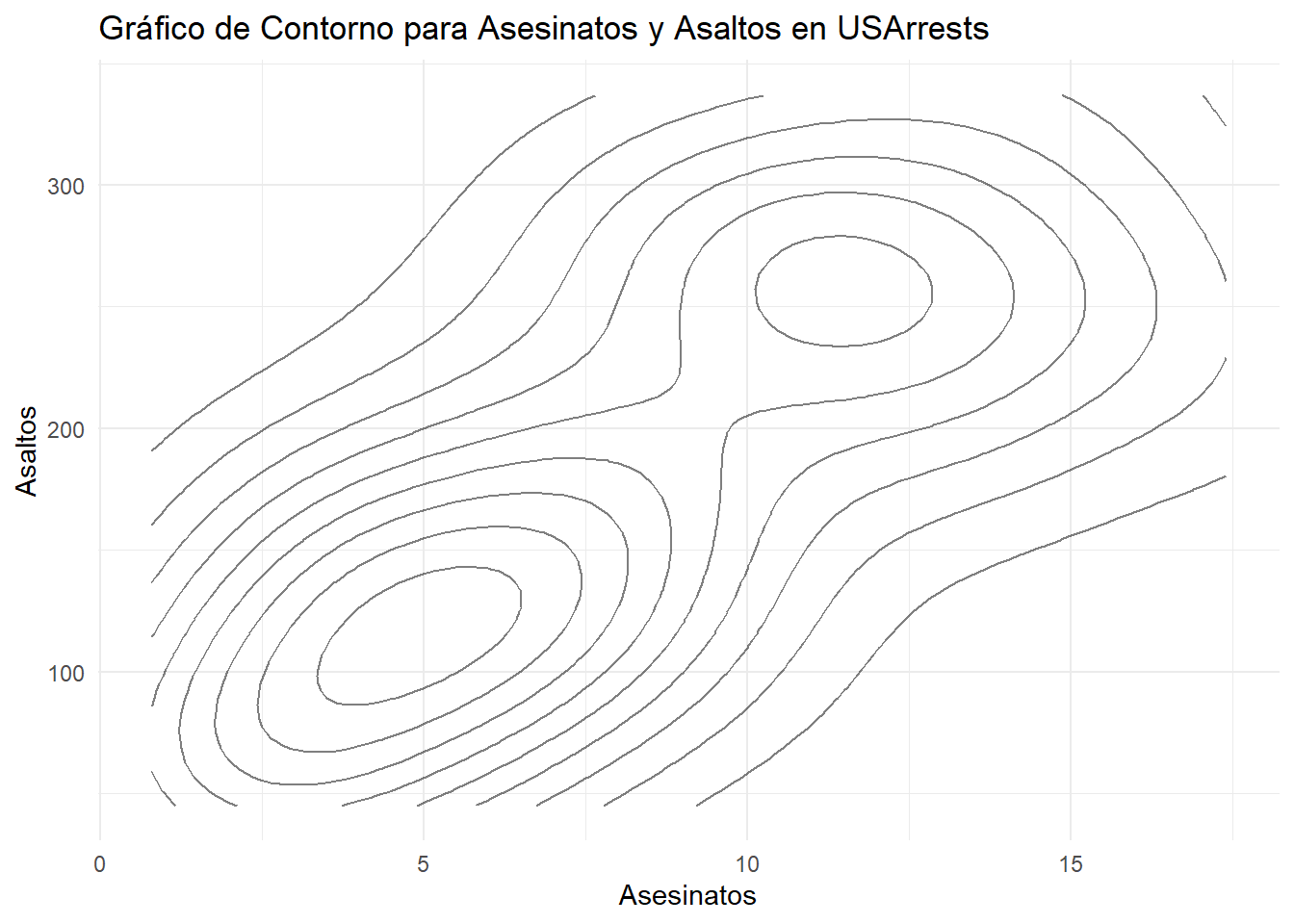 Este gráfico de contorno proporciona una representación visual de la densidad de observaciones en el espacio bidimensional de las variables “Asesinatos” y “Asaltos” en el conjunto de datos USArrests.