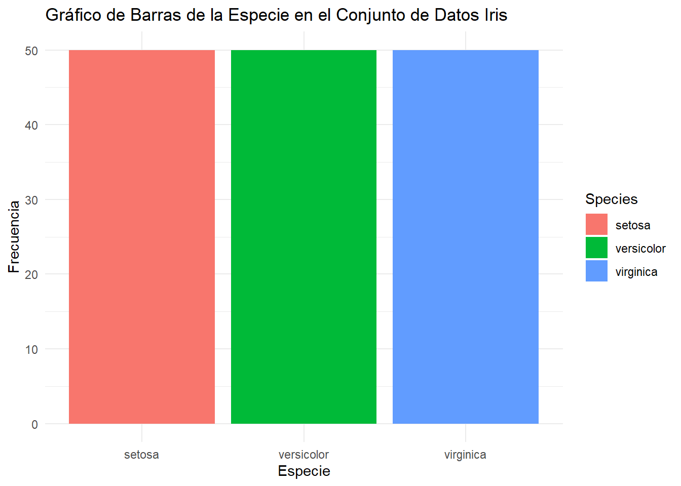ggplot(iris, aes(x = Species, fill = Species)) +geom_bar() +labs(title ="Gráfico de Barras de la Especie en el Conjunto de Datos Iris", x ="Especie", y ="Frecuencia") +theme_minimal()