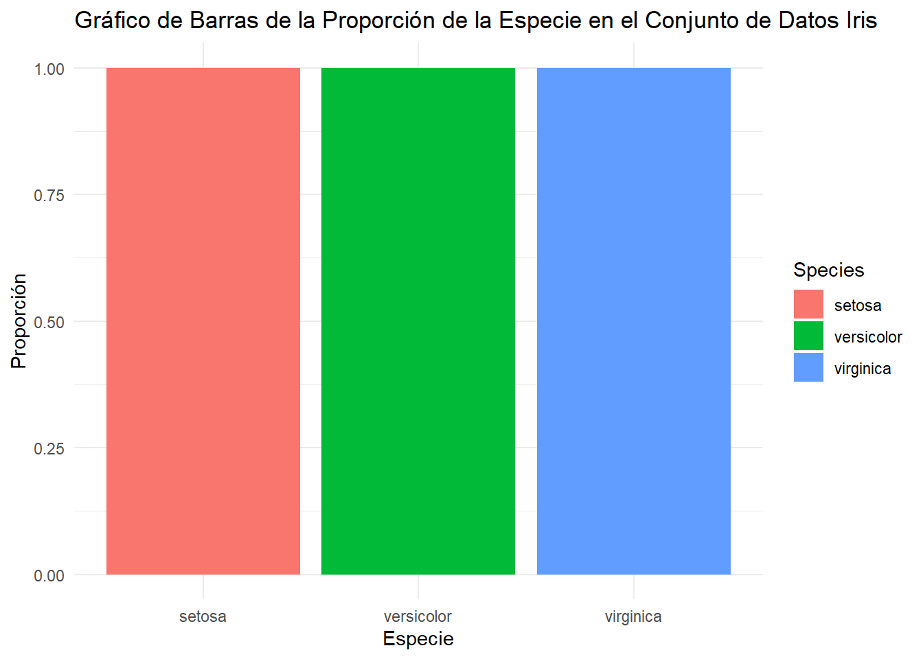 ggplot(iris, aes(x = Species, fill = Species)) +geom_bar(position ="fill") +labs(title ="Gráfico de Barras de la Proporción de la Especie en el Conjunto de Datos Iris", x ="Especie", y ="Proporción") +theme_minimal()