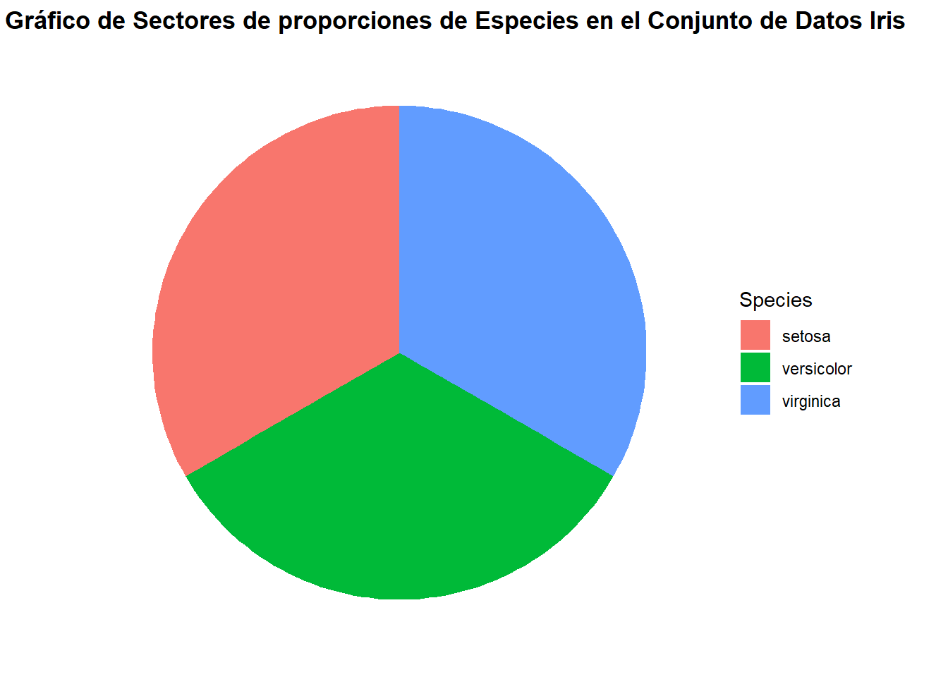 ggplot(iris, aes(x ="", fill = Species)) +geom_bar(width =1) +coord_polar("y") +labs(title ="Gráfico de Sectores de proporciones de Especies en el Conjunto de Datos Iris") +theme_minimal() +theme(axis.text =element_blank(), # Ocultar etiquetas del eje xaxis.title =element_blank(), # Ocultar título del eje ypanel.grid =element_blank(), # Ocultar líneas de la cuadrículaplot.title =element_text(size =13, face ="bold", hjust =0.3) # Ajustes del título )