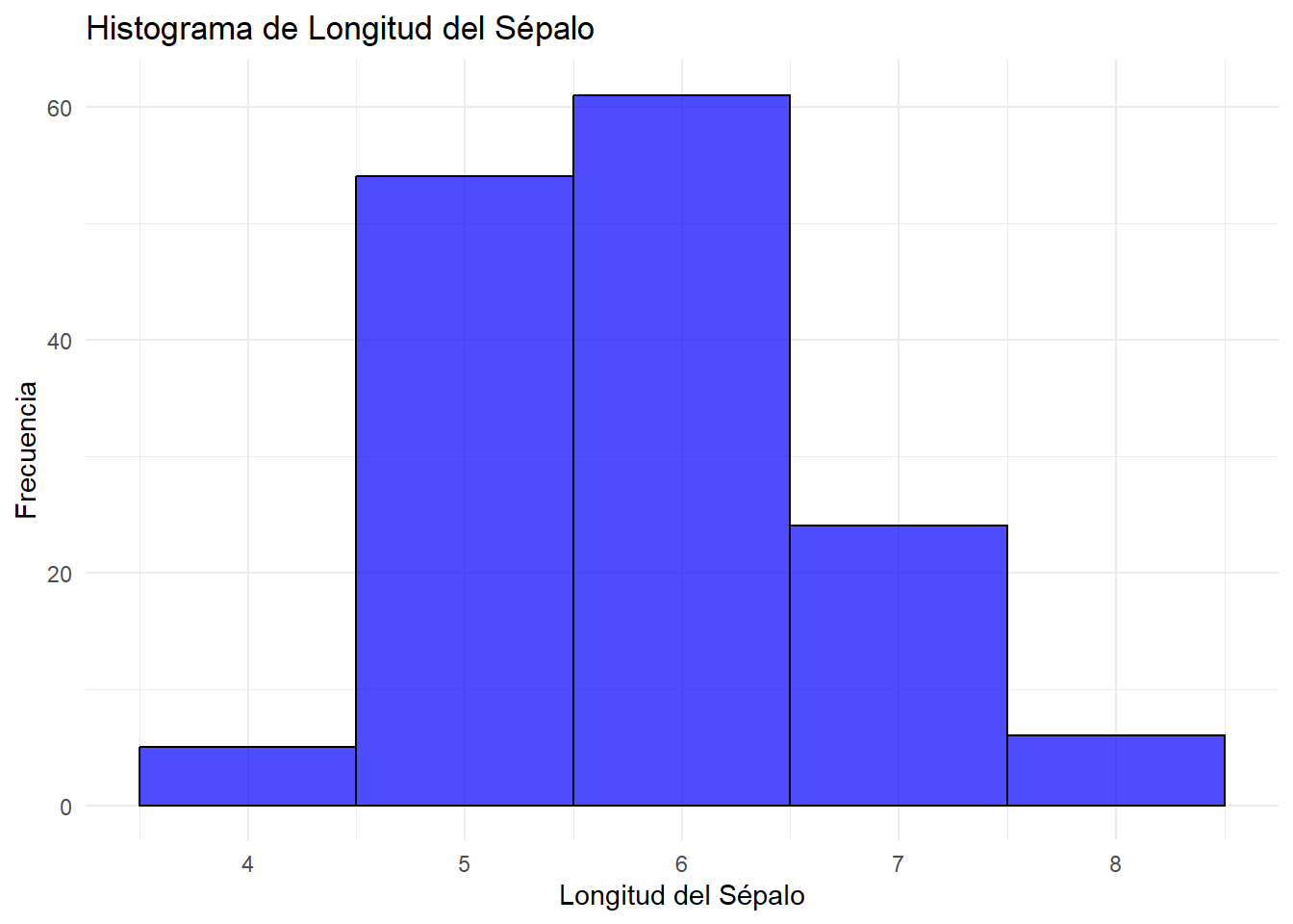 # Crear un histograma para la longitud del sépalo (Sepal.Length)ggplot(iris, aes(x = Sepal.Length)) +geom_histogram(binwidth =0.1, fill ="blue", color ="black", alpha =1.4) +labs(title ="Histograma de Longitud del Sépalo",x ="Longitud del Sépalo",y ="Frecuencia") +theme_minimal()