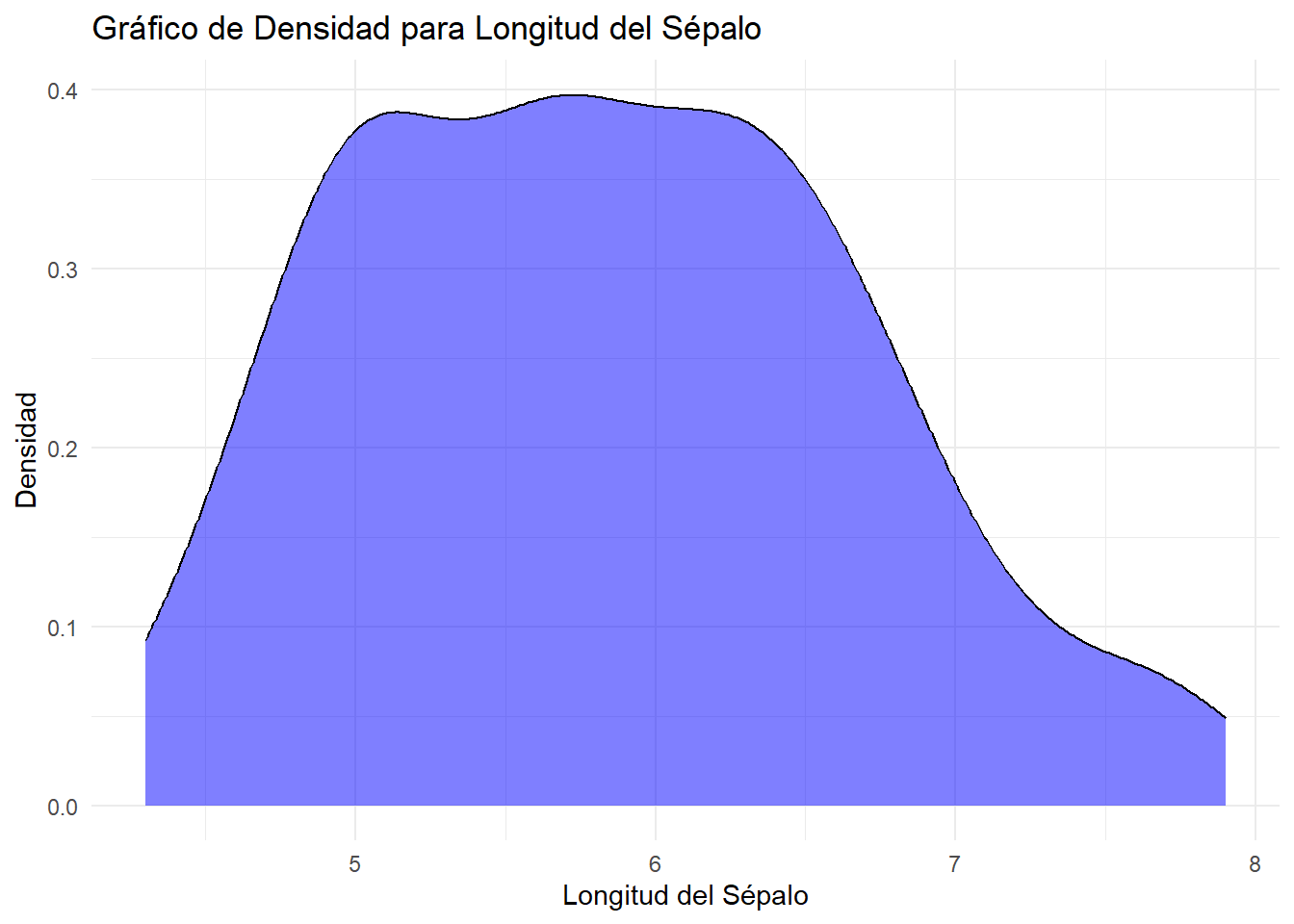 # gráfico de densidad para la longitud del sépalo (Sepal.Length)ggplot(iris, aes(x = Sepal.Length, fill = Species, color = Species)) +geom_density(alpha =0.5, fill ="blue", color ="black") +labs(title ="Gráfico de Densidad para Longitud del Sépalo",x ="Longitud del Sépalo",y ="Densidad") +scale_fill_manual(values ="blue", guide =FALSE) +scale_color_manual(values ="black", guide =FALSE) +theme_minimal()