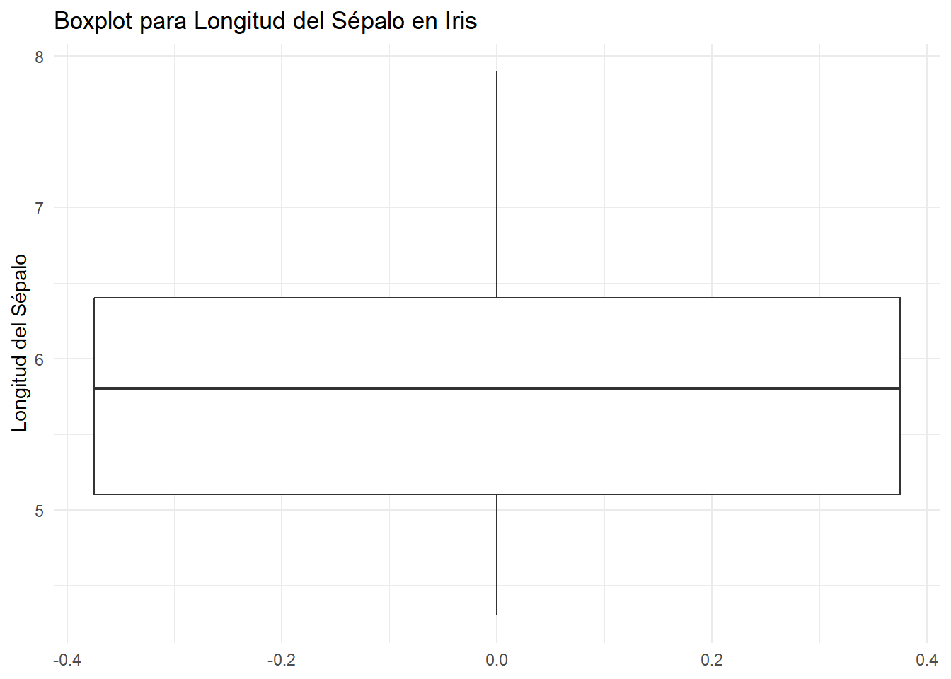 # Instalar y cargar la librería ggplot2 si aún no lo has hecho# install.packages("ggplot2")library(ggplot2)# Crear un boxplot para la variable Sepal.Length en irisggplot(iris, aes(y = Sepal.Length)) +geom_boxplot() +labs(title ="Boxplot para Longitud del Sépalo en Iris",y ="Longitud del Sépalo") +theme_minimal()