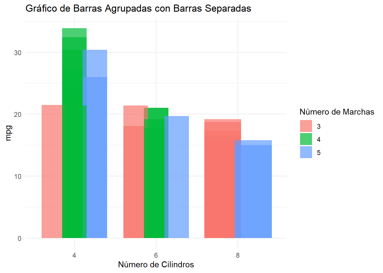 # Gráfico de barras agrupadas con el conjunto de datos mtcarsggplot(mtcars, aes(x =factor(cyl), fill =factor(gear), group = gear)) +geom_bar(aes(y = mpg), position =position_dodge(width =0.75), stat ="identity", alpha =0.7) +labs(title ="Gráfico de Barras Agrupadas con Barras Separadas",x ="Número de Cilindros",y ="mpg",fill ="Número de Marchas") +theme_minimal()