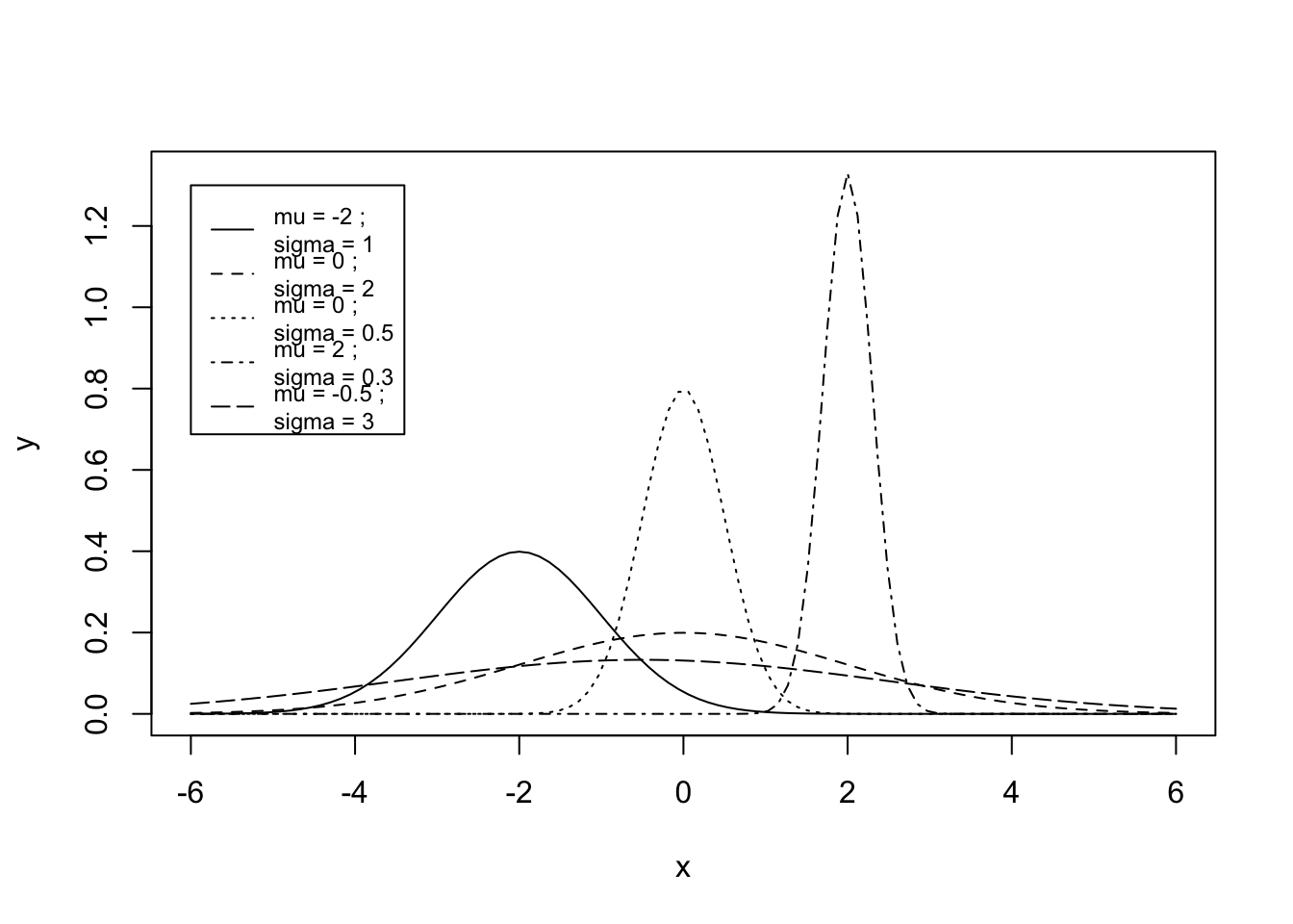 sigma =",c(1,2,.5,.3,3) ), lty=1:5, col=1, cex=.75 )