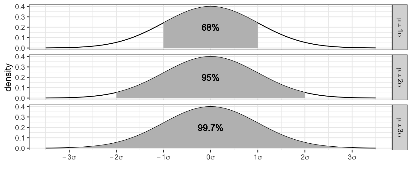 Empirical Rules: It is from the normal distribution that the empirical rules from the previous chapter is derived. If \(X\sim N(\mu,\sigma^{2})\) then \[\begin{aligned} P(\mu-\sigma\le X\le\mu+\sigma) &= P(-1 \le Z \le 1) \\ &= P(Z \le 1) - P(Z \le -1) \\ &\approx 0.8413-0.1587 \\ &= 0.6826 \end{aligned}\]