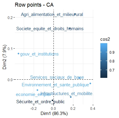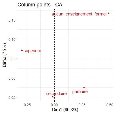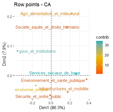 Ce regroupement permet de constituer une variable qualitative synthétique, mieux adaptée à la visualisation dans un plan factoriel. Il évite également la dispersion des modalités rares, qui compliqueraient l’interprétation des axes de l’AFC.
