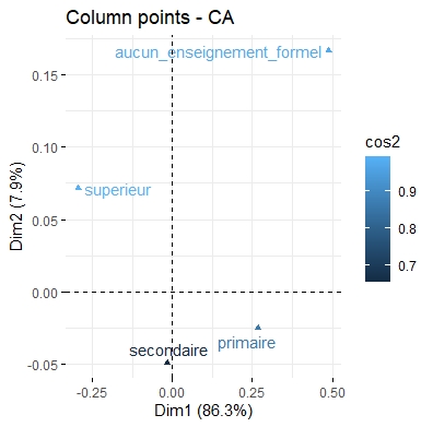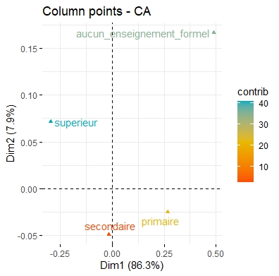 | Contribution | Part de variance de chaque modalité expliquée par une dimension |