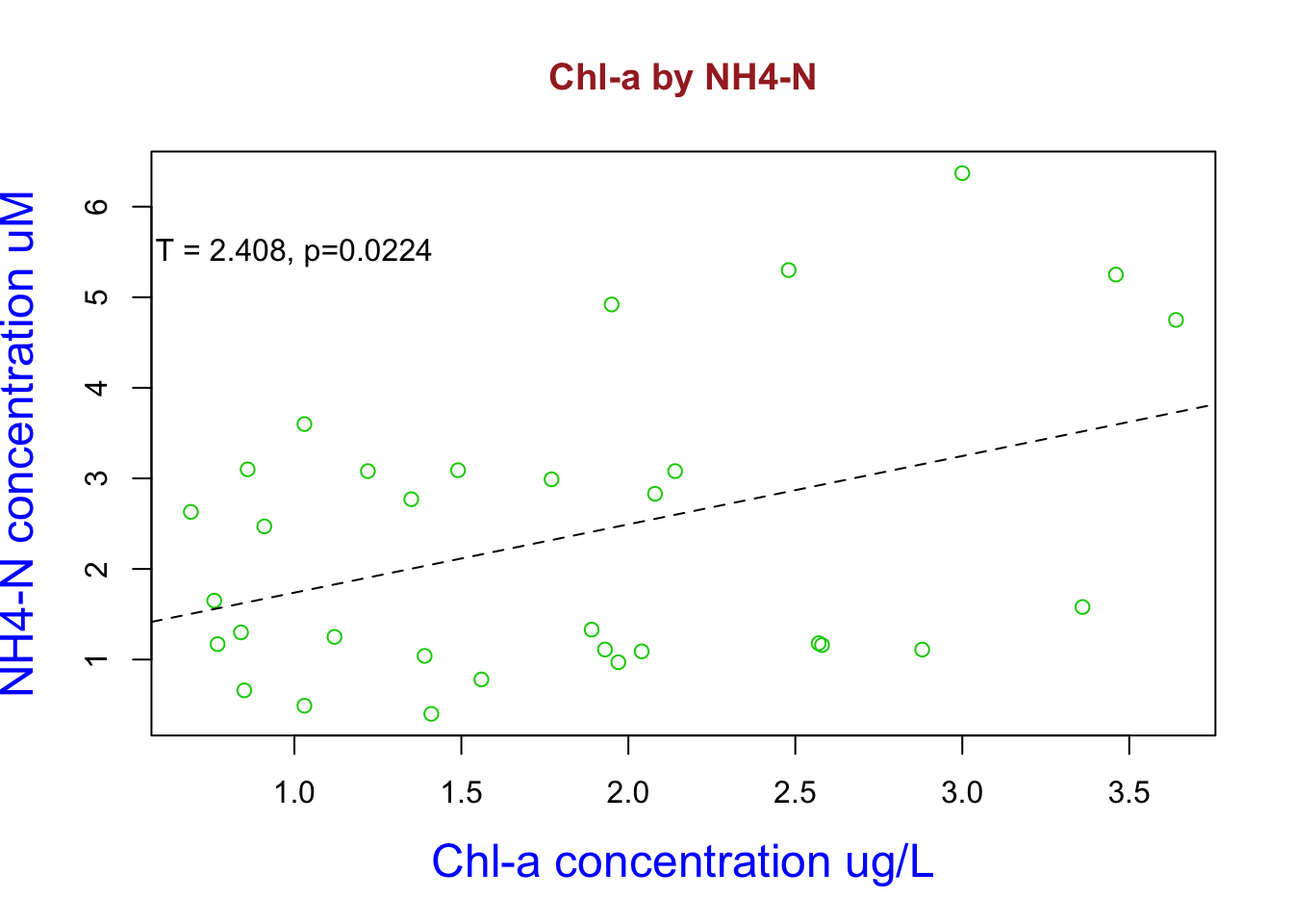 ** Here I used my dataset to look at the bivariate relationship between NH4-N and chl-a concentrations. Here I constructed a linear model and named it fit1. I then reviewed the statistics and it happens to be statistical significant. Increasing NH4 concentrations increases chl-a abundance. I add this the linear model regression line by using the abline argument and added the significant t and p values using the text argument**