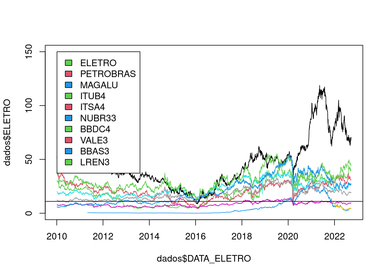 legend(x=dados$DATA_ELETRO[1],y=150,legend = c("ELETRO","PETROBRAS","MAGALU","ITUB4","ITSA4","NUBR33","BBDC4","VALE3","BBAS3", "LREN3"),fill=c(3,2,4))