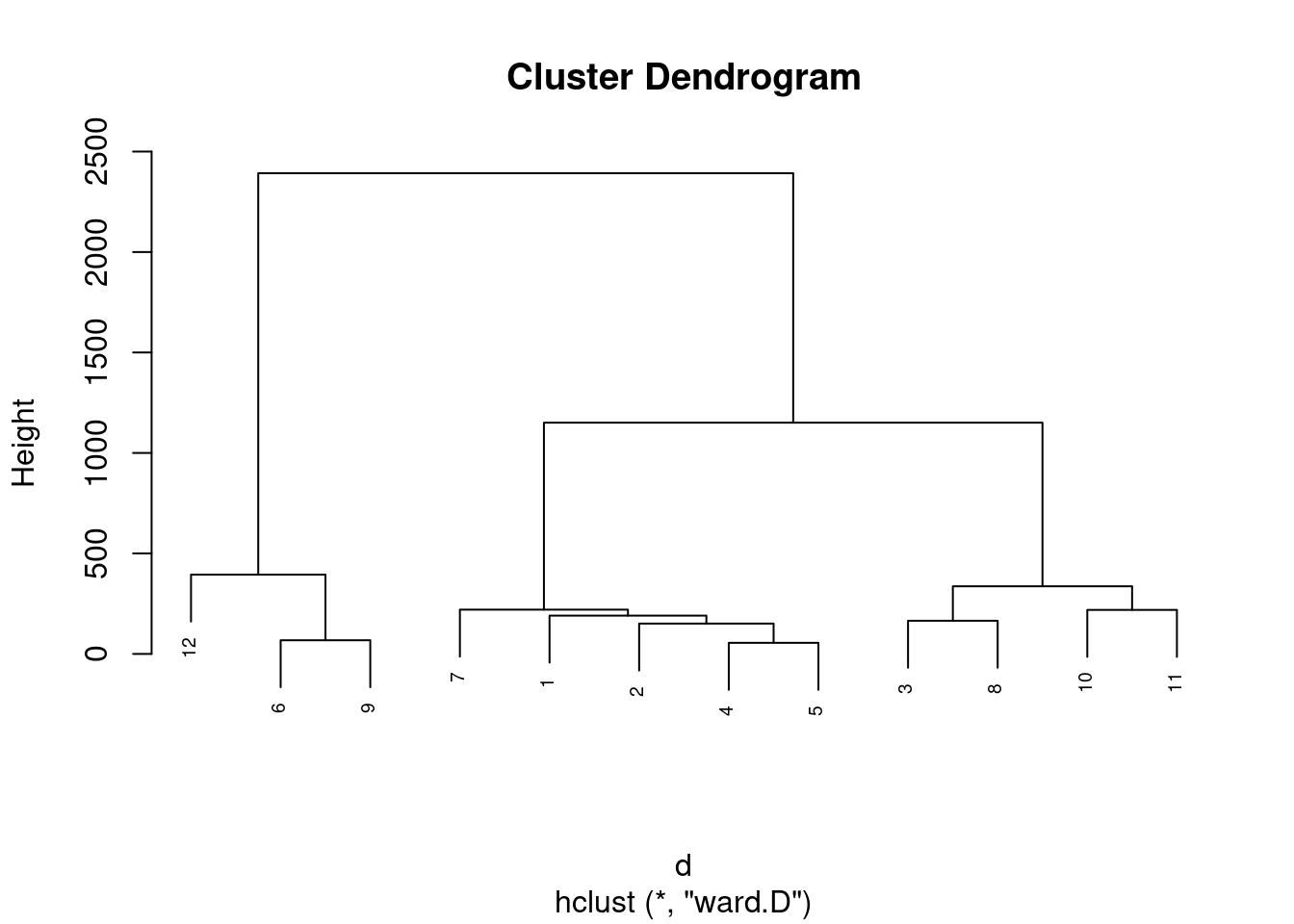 groups <- cutree(grup, k=3)table(groups, disco$deslocamento)##