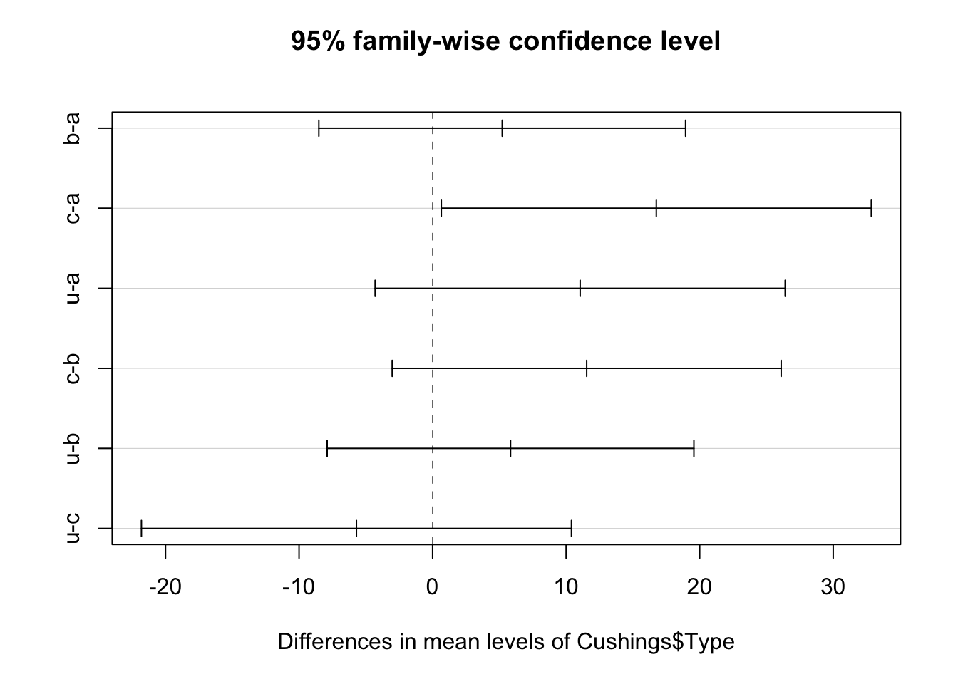 Ejemplo 13.1 Utilizando la librería MASS y la base de datos Cushings realice una prueba de ANOVA e indique entre grupos de Cushings se presentan la diferencias. Utilice el procedimiento de correción de Bonferroni