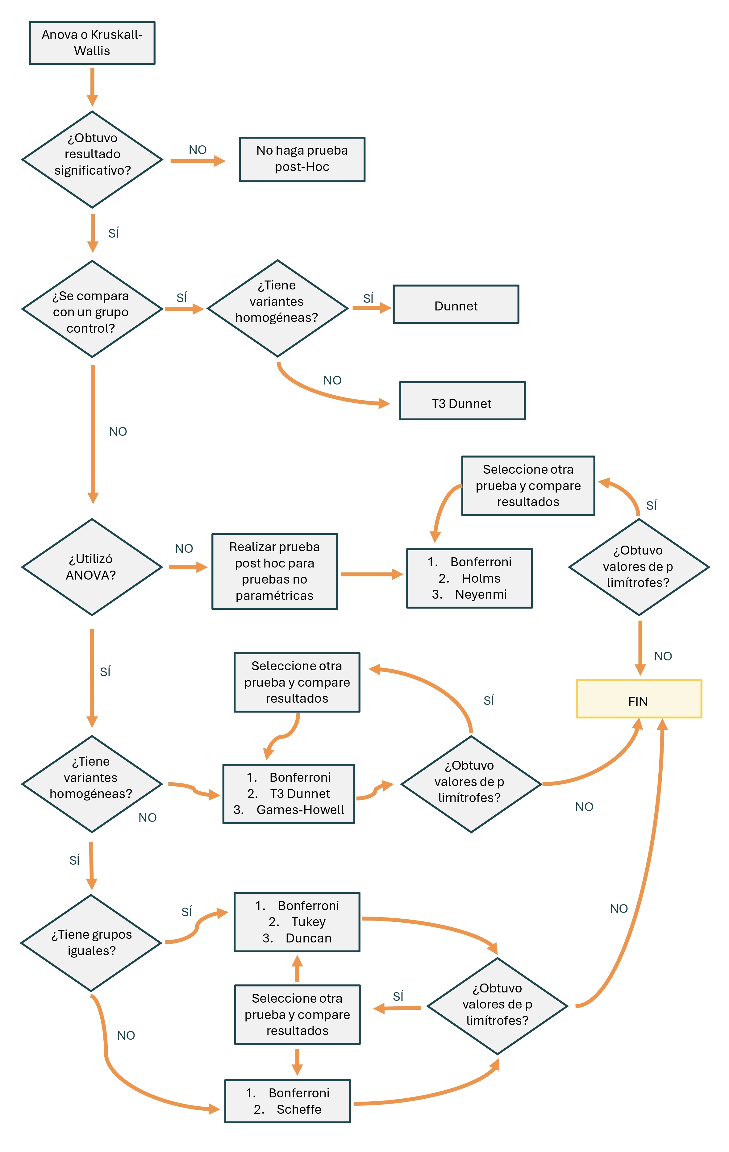 Tras obtener un resultado significativo en un análisis de varianza (ANOVA) o en una prueba de Kruskal-Wallis, el siguiente objetivo metodológico es determinar cuál de los grupos bajo estudio contribuye a esta significación estadística. Específicamente, se busca identificar qué grupos muestran diferencias significativas entre sí. En una situación donde se comparan cuatro grupos distintos, se necesitarían efectuar un total de seis comparaciones emparejadas: