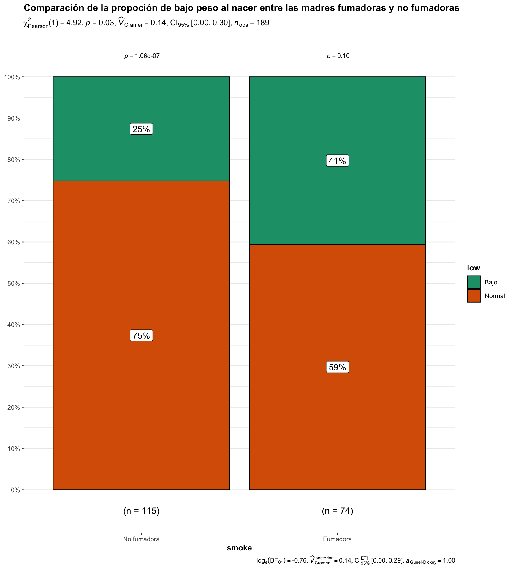Se puede crear un gráfico de barras para que nos oriente de las frecuencias de los recién nacidos con peso bajo entre las mujeres que fumaron en el primer trimestre del embarazo y las que no