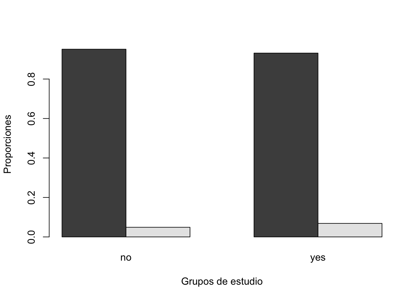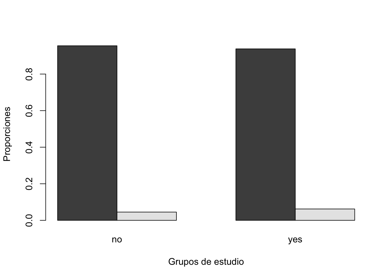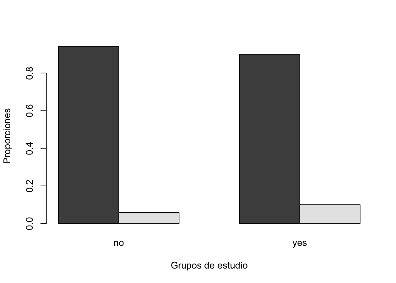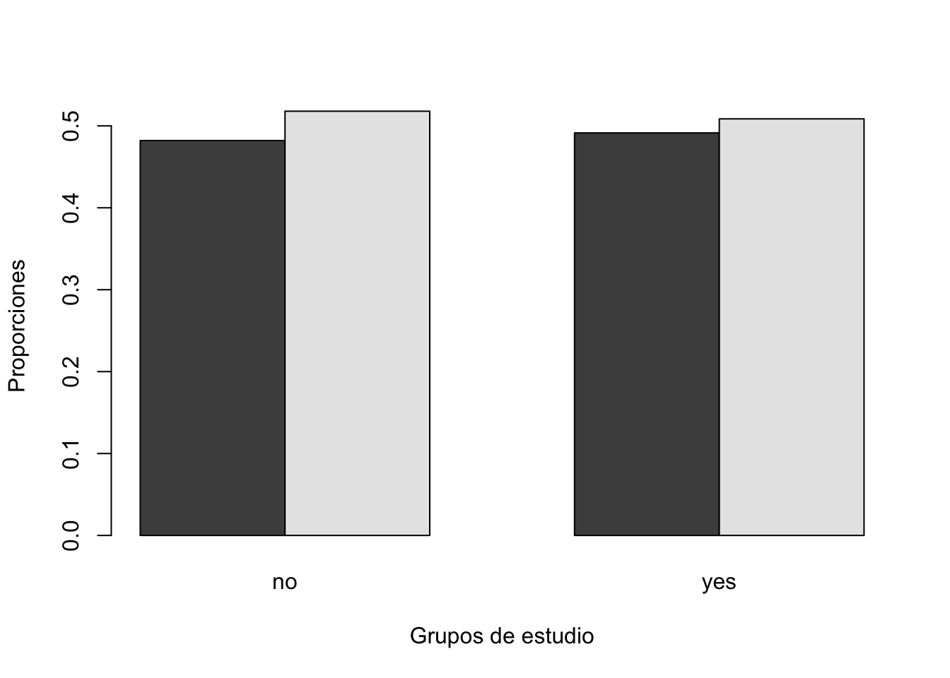 Una gráfica de conteos, no es lo más adecuado ya que puede mostrar información engañosa. Por lo tanto lo más adecuado es hacer una gráfica de proporciones utilizando la función prop.table. Específicamente, una comparación más adecuada sería comparar las proporciones por columna.