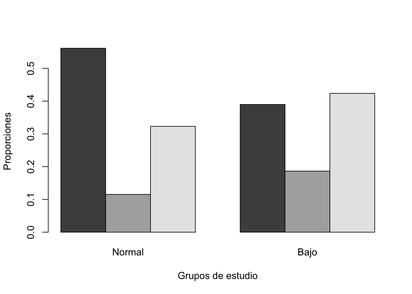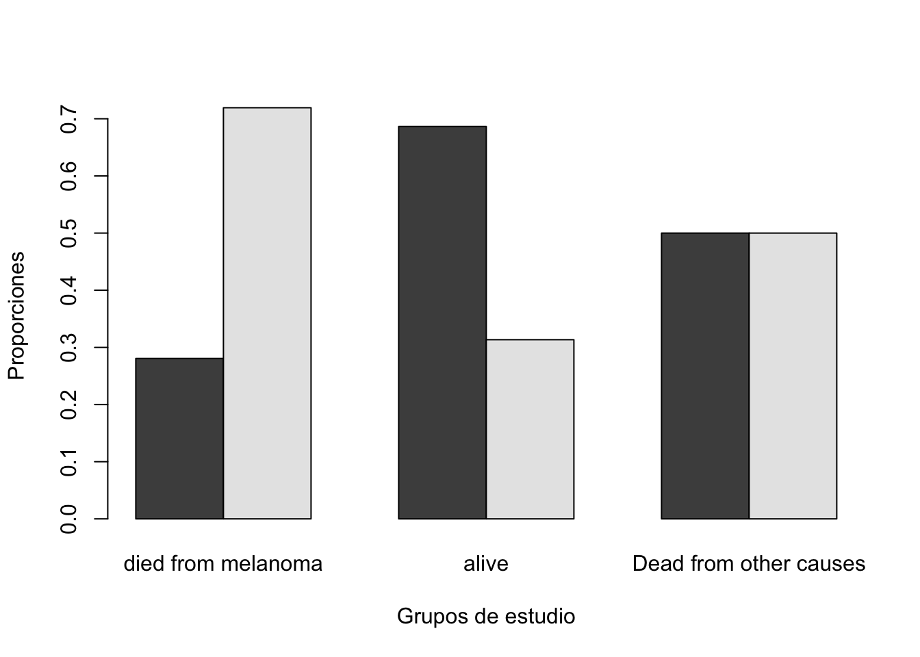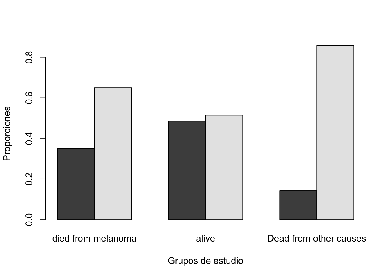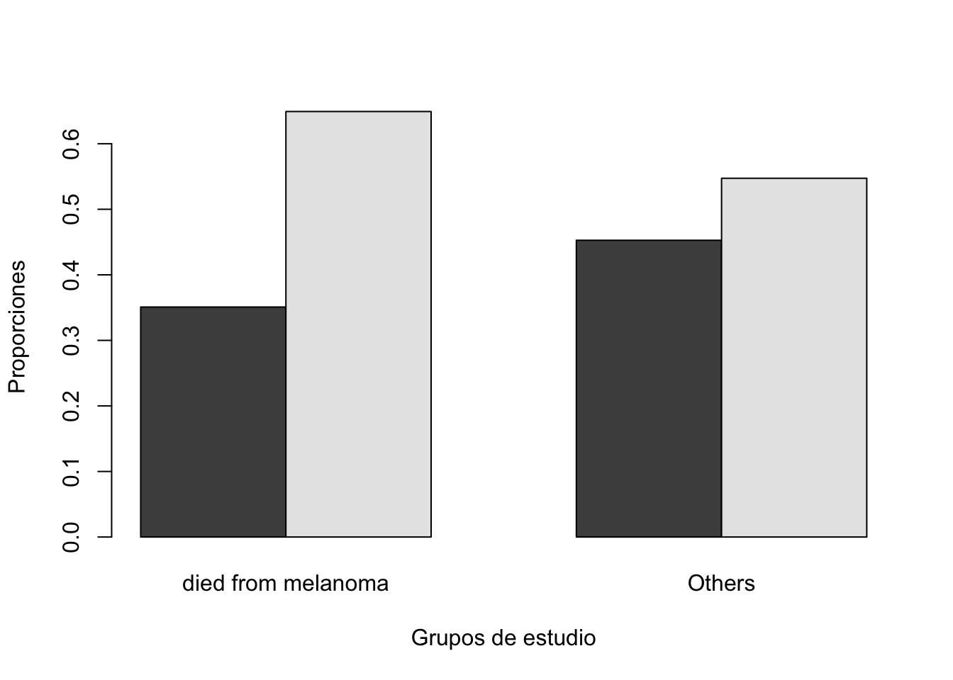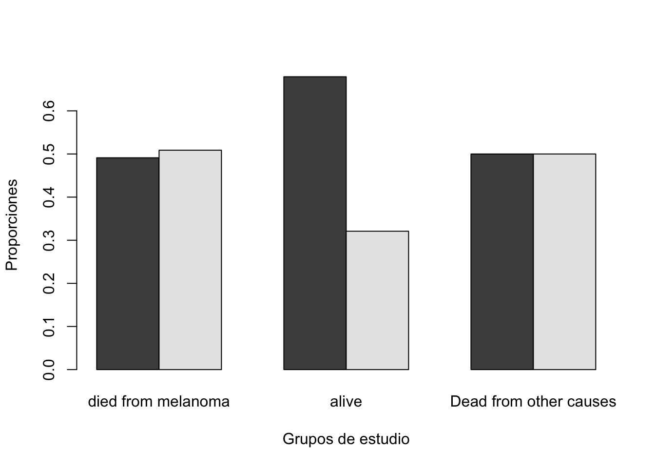 Una gráfica de conteos, no es lo más adecuado ya que puede mostrar información engañosa. Por lo tanto lo más adecuado es hacer una gráfica de proporciones utilizando la función prop.table. Específicamente, una comparación más adecuada sería comparar las proporciones por columna.