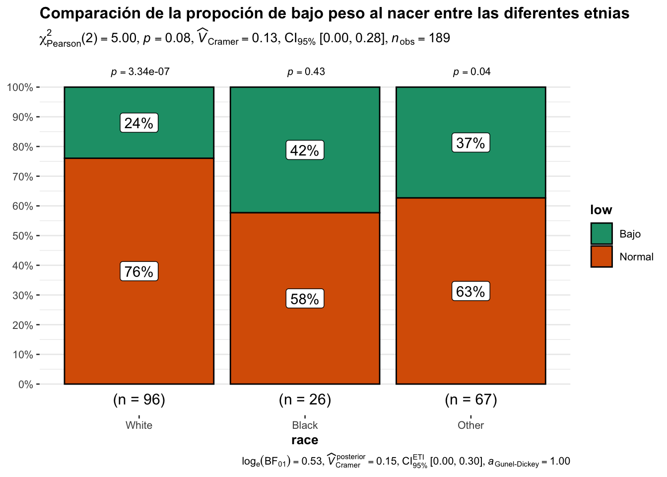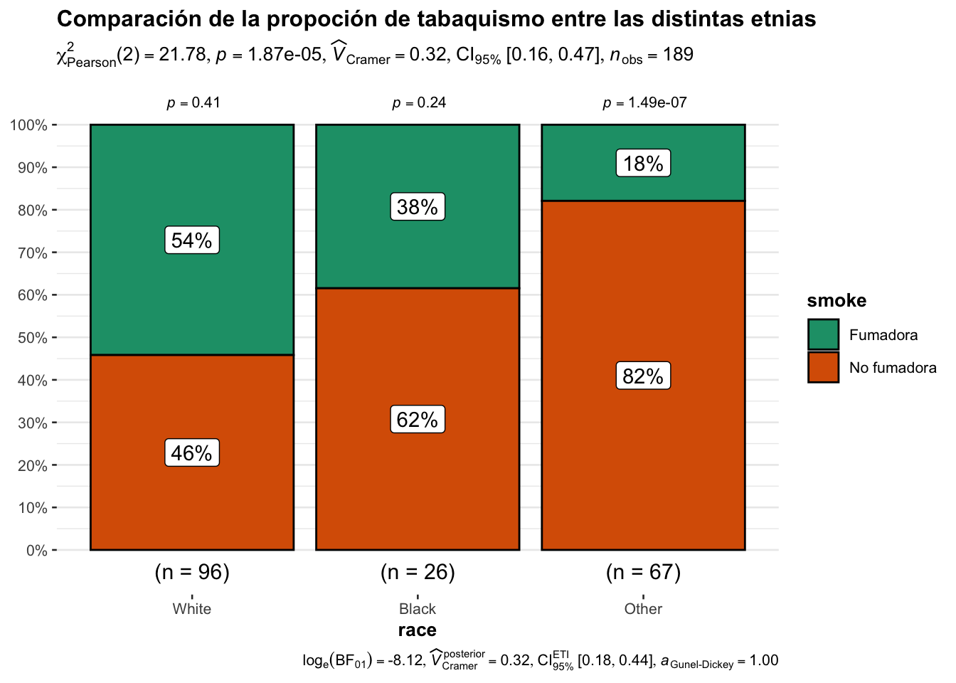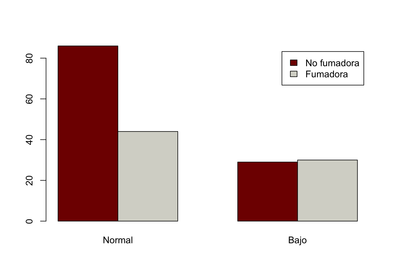 library(MASS)data("birthwt")## El siguiente código fue copiado del capitulo anteriorbirthwt$low <-factor(birthwt$low, labels =c("Normal", "Bajo"))birthwt$race <-factor(birthwt$race, labels =c("White", "Black", "Other"))birthwt$smoke <-factor(birthwt$smoke, labels =c("No fumadora", "Fumadora"))birthwt$ht <-factor(birthwt$ht, labels =c("No hipertensión", "Hipertensión"))birthwt$ui <-factor(birthwt$ui, labels =c("No irritabilidad", "Irritabilidad"))birthwt$ht <-factor(birthwt$ht, labels =c("No hipertensión", "Hipertensión"))## Note como si sabe el orden de los niveles no es necesario declararlosattach(birthwt)tab1<-table(smoke, low)tab1