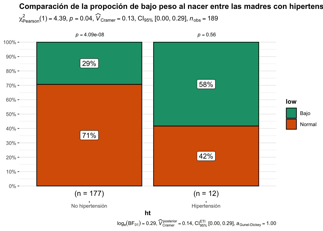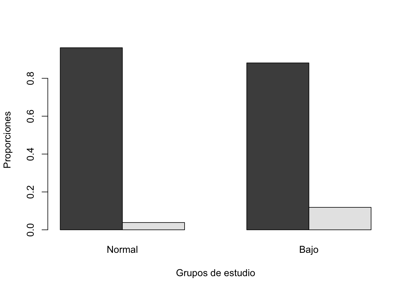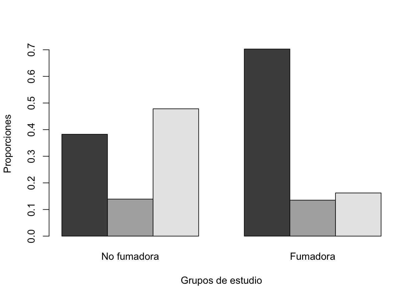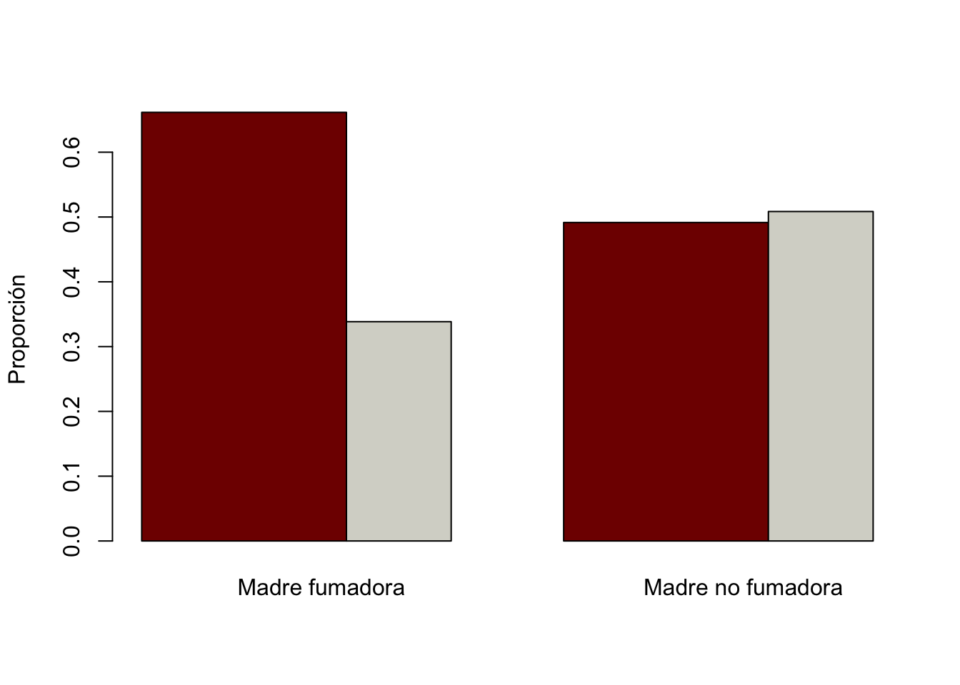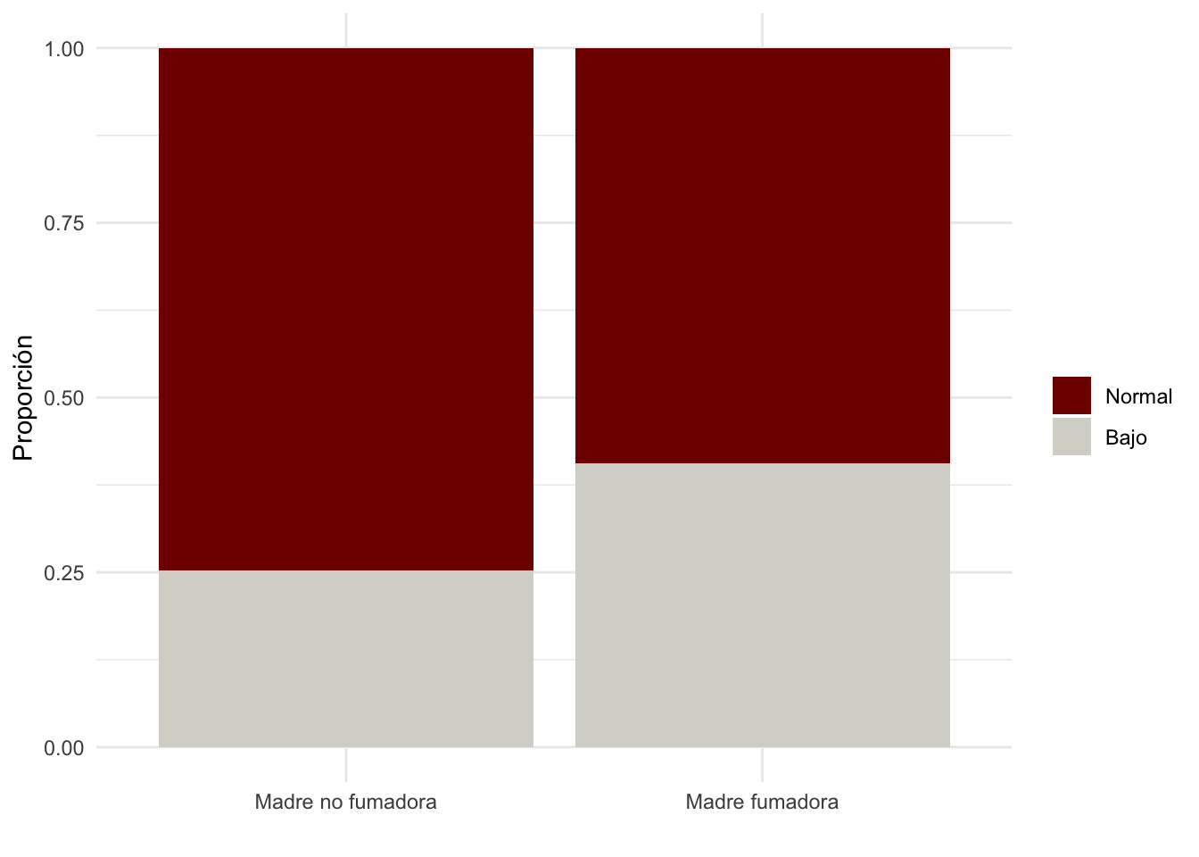 # Cargar las librerías necesariaslibrary(ggplot2) # Para crear gráficos utilizando ggplot2# Crear la gráfica directamente desde el conjunto de datos birthwtbirthwt|>ggplot(aes(x=smoke, fill=low))+# Fill nos permite separar por colores utilizando la variable lowgeom_bar(stat="count", position="fill")+# Position fill nos permite obtener las proporcionesscale_fill_manual(values =c("#800000FF", "#D6D6CEFF")) +# Especificar los colores de las barrasylab("Proporción") +# Etiquetar el eje Yxlab("") +# Quitar la etiqueta del eje X (opcional)labs(fill ="") +# Quitar la etiqueta de la leyenda (opcional)theme_minimal() +# Usar un tema minimalista para el gráficoscale_x_discrete(labels =c("Madre no fumadora", "Madre fumadora")) # Etiquetar los valores del eje X