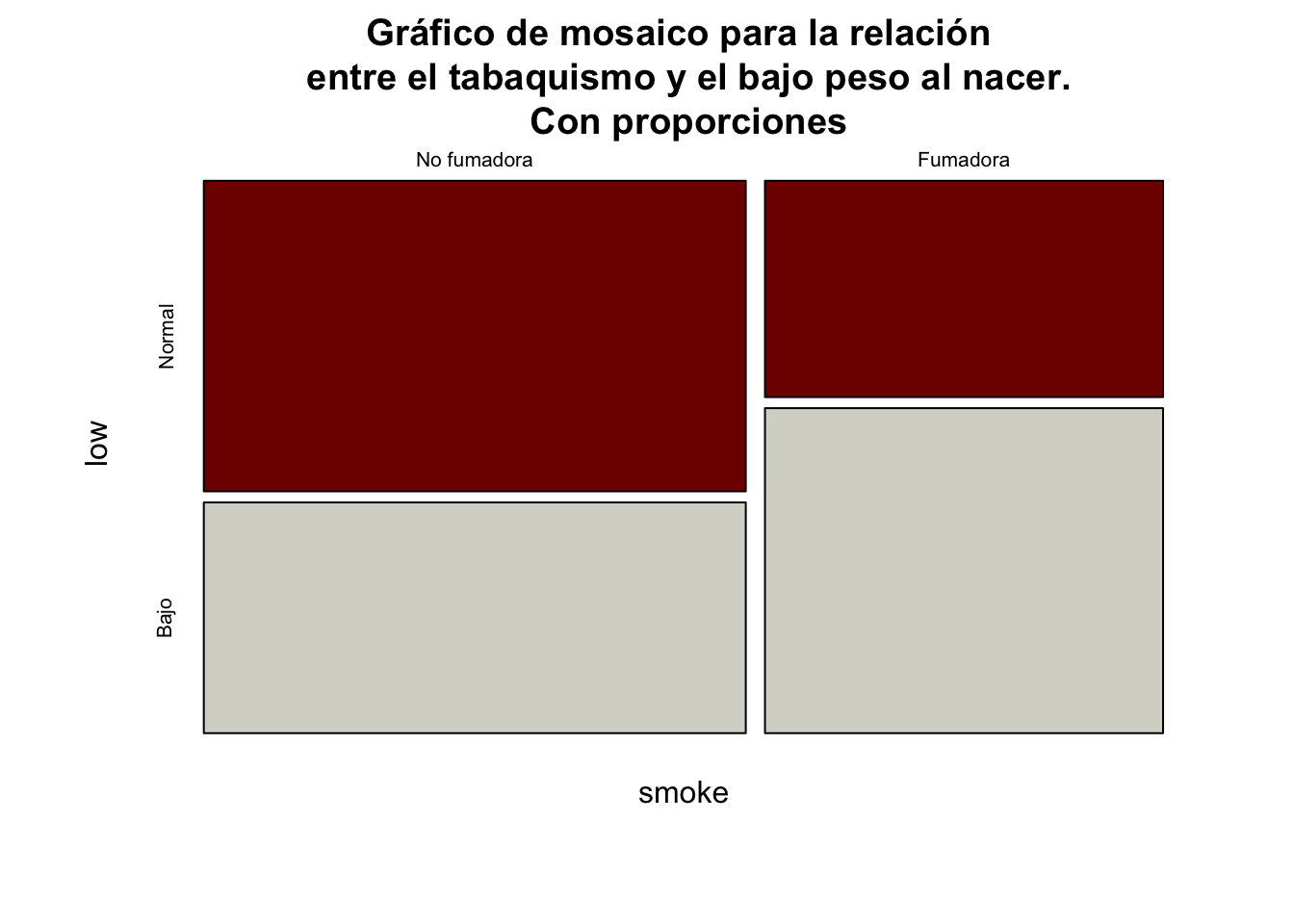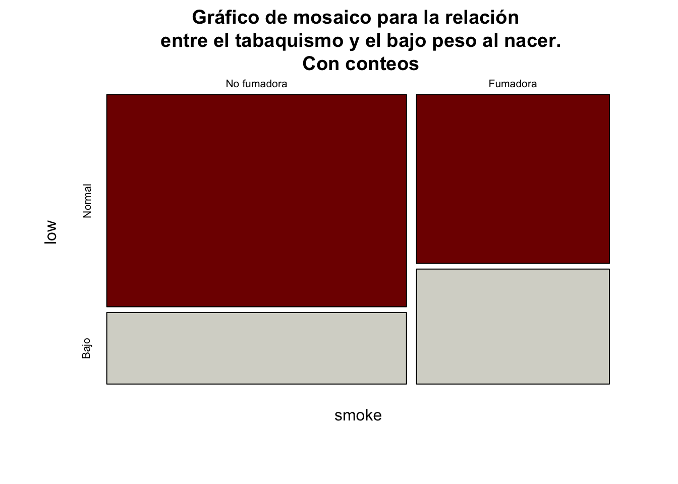 mosaicplot(tab1, color =c("#800000FF", "#D6D6CEFF"),main="Gráfico de mosaico para la relación \n entre el tabaquismo y el bajo peso al nacer.\n Con conteos")