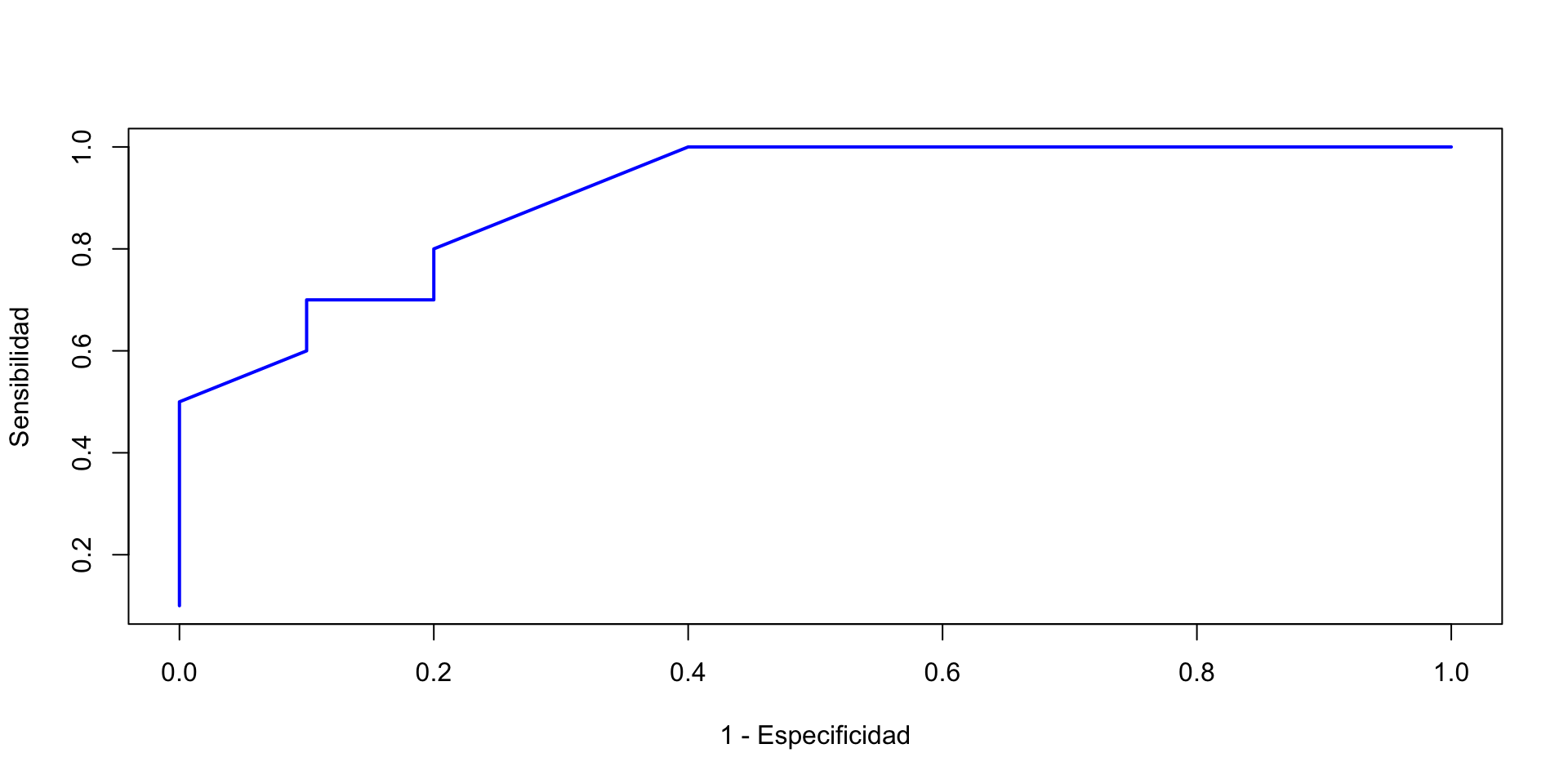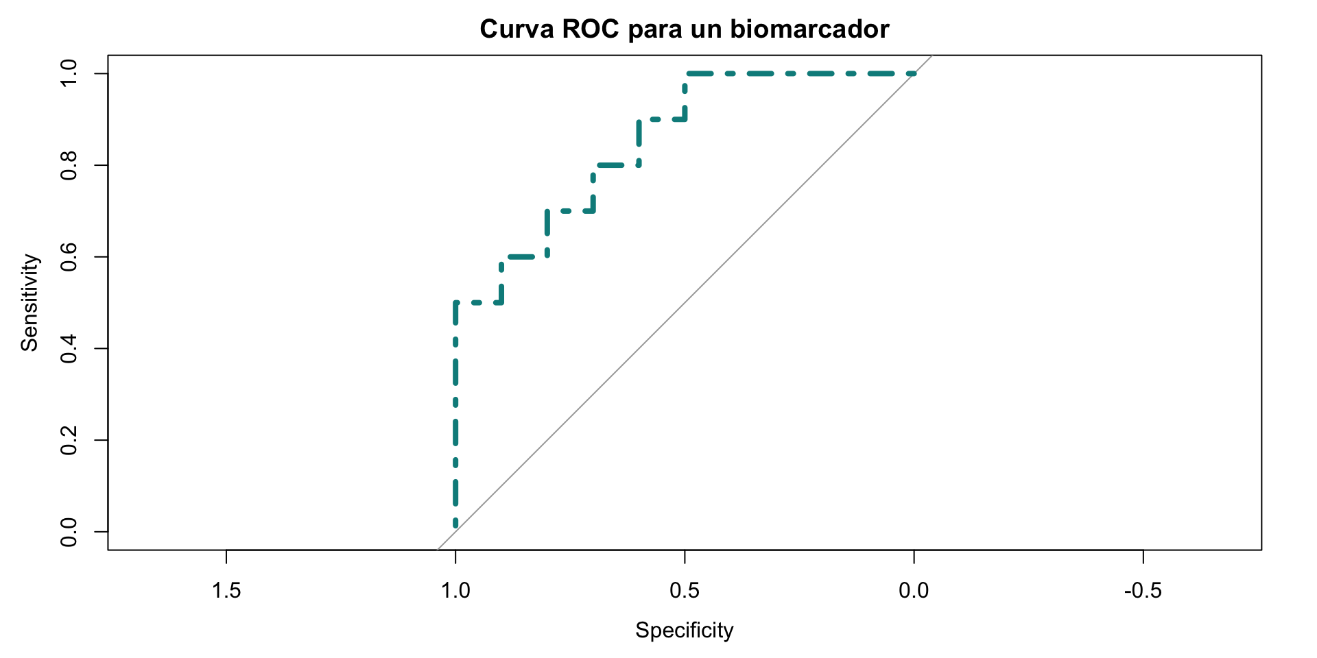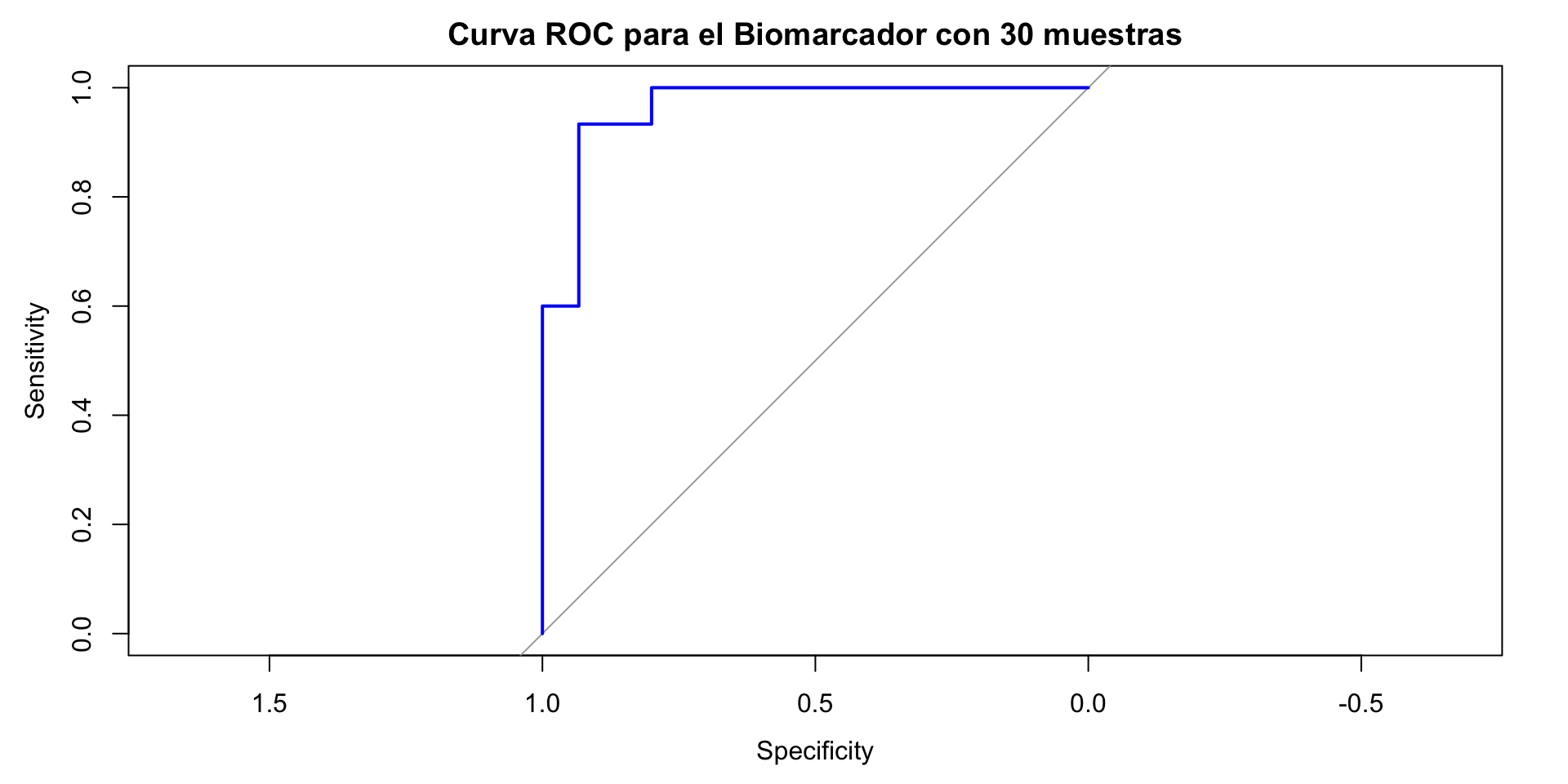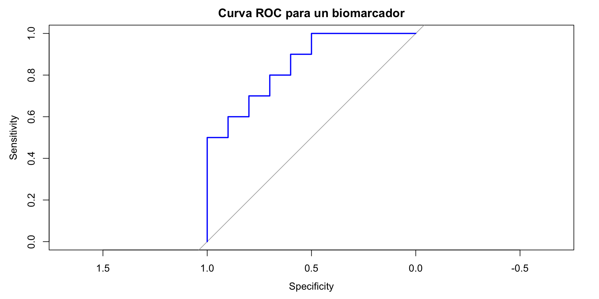 plot(roc_curve, main ="Curva ROC para un biomarcadore", col ="blue")