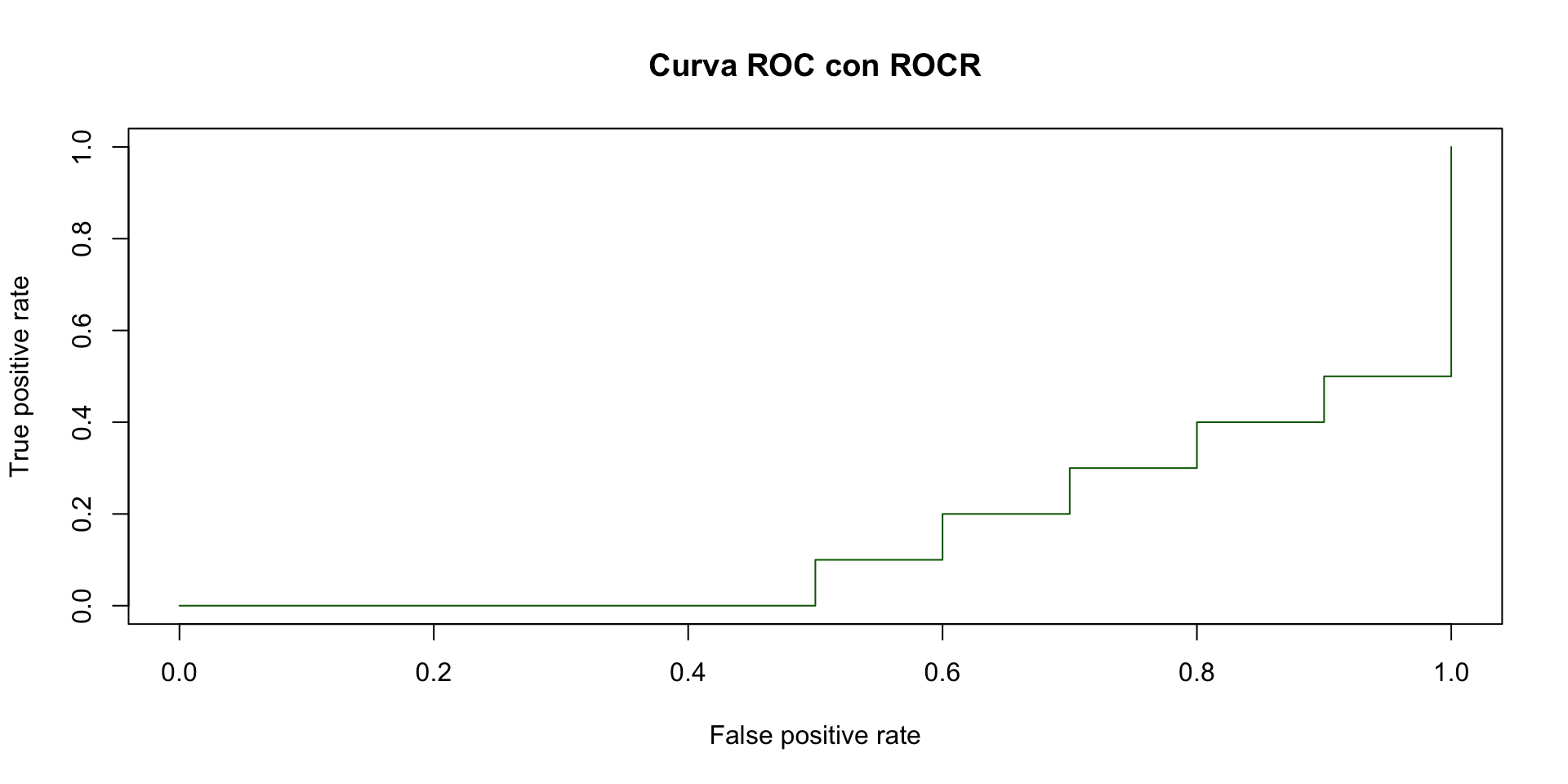 # Instalar y cargar ROCR si es necesarioinstall.packages("ROCR")library(ROCR)# Datos de ejemplopred <-prediction(df$Concentración, df$Evento)perf <-performance(pred, "tpr", "fpr")# Graficar la curva ROCplot(perf, main ="Curva ROC con ROCR", col ="darkgreen")