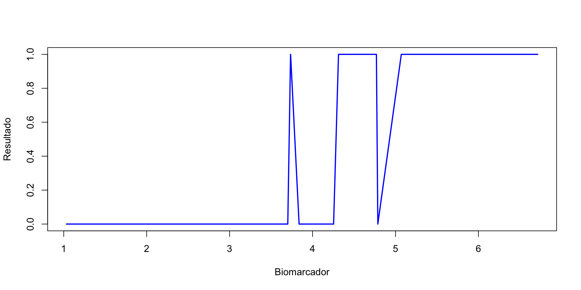 plot(Datos$biomarker_values, Datos$outcome, type ="l", col ="blue", lwd =2, xlab ="Biomarcador", ylab ="Resultado")