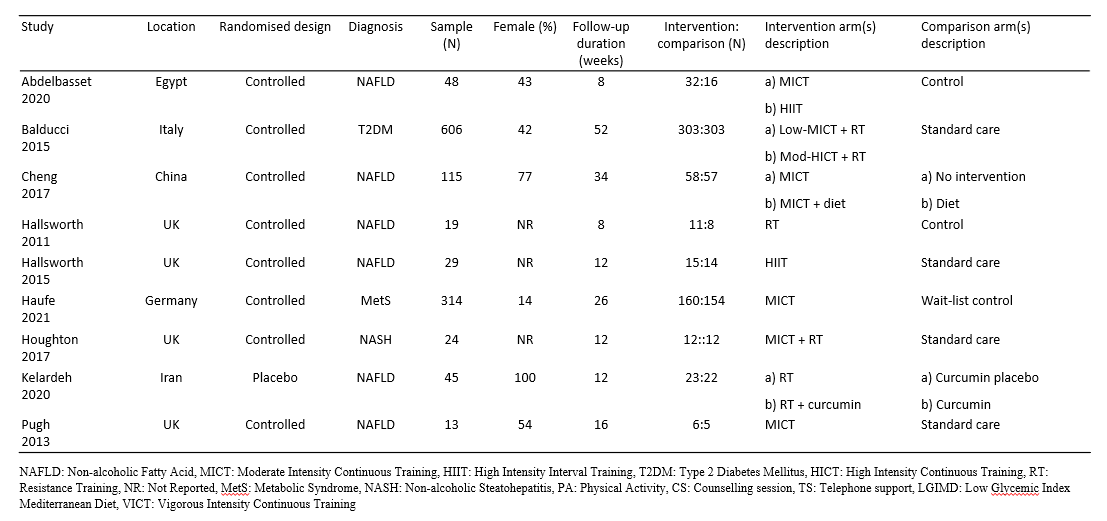 Human studies had one (N = 13), two (N = 4), or three (N = 1) intervention arms that were relevant to this review. The interventions included only moderate-intensity continuous training (N = 8), resistance training (N = 4), high-intensity interval training (N = 2), moderate-intensity continuous training combined with resistance training (N = 4), vigorous-intensity training (N = 1), or physical activity guidelines and counselling support (N = 1). The comparison conditions included a no intervention control (N = 7), standard care (N = 3), general diet and/or physical activity advice (N = 3), a wait-list control (N = 1), placebo supplement (N = 1), control diet (N = 1), or stretching (N = 1).