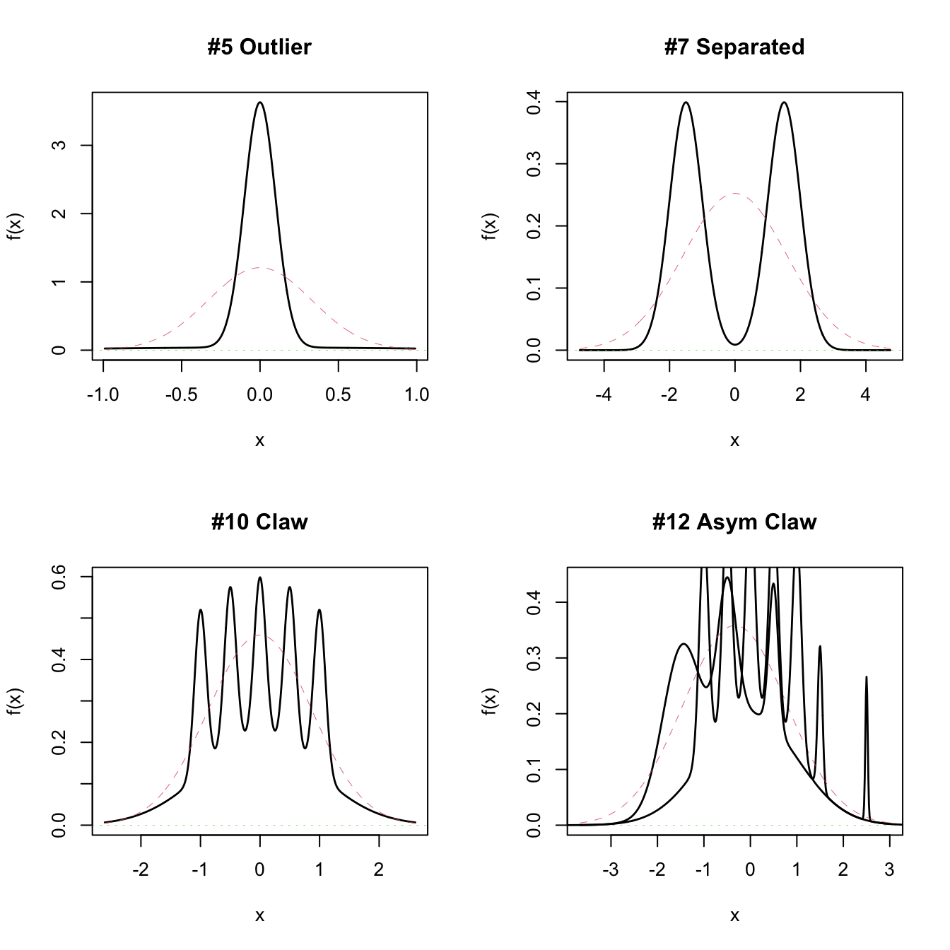 We focus now on exploring the empirical performance of bandwidth selectors. The workhorse for doing that is simulation. A popular collection of simulation scenarios was given by Marron and Wand (1992) and are conveniently available through the package nor1mix. They form a collection of normal \(r\)-mixtures of the form