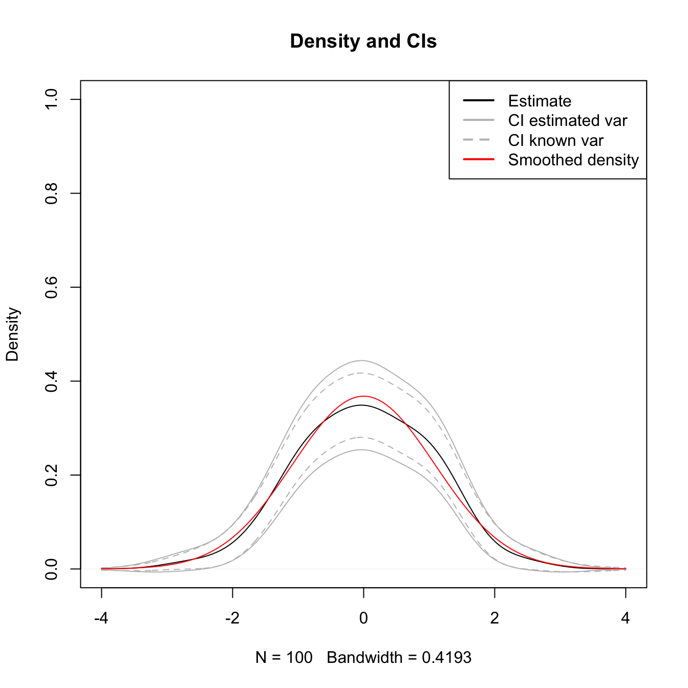 plot(kde, main = "Density and CIs", ylim = c(0, 1))