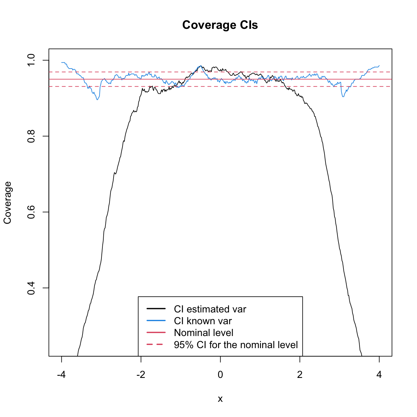 The following piece of code evaluates the proportion of times that \(\mathbb{E}[\hat f(x;h)]\) belongs to \(I\) for each \(x\in\mathbb{R},\) both estimating and knowing the variance in the asymptotic distribution.