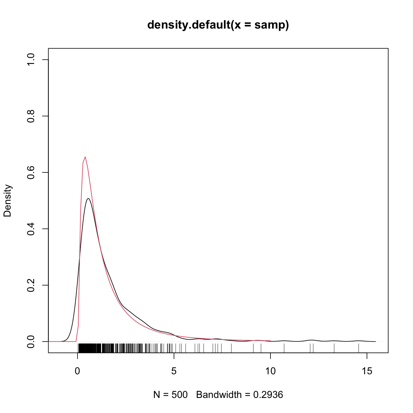 curve(dlnorm(x), from = -2, to = 10, col = 2, add = TRUE)