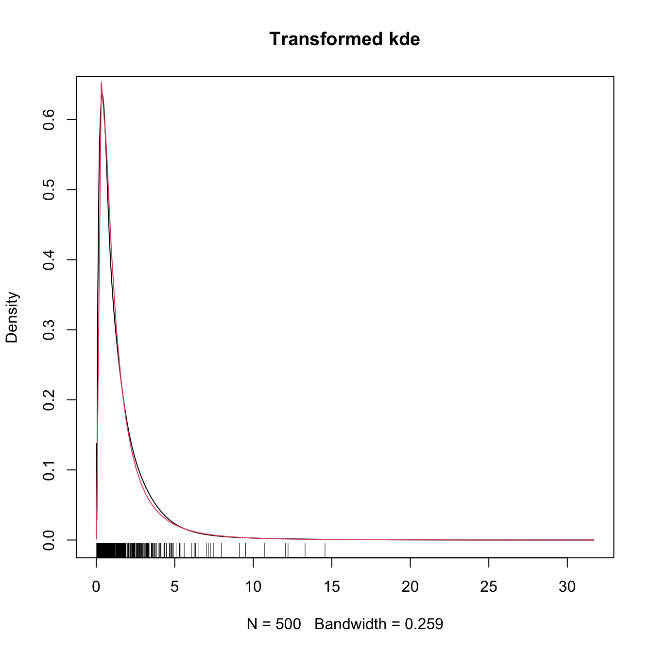 Note that \(h\) is in the scale of \(t(X_i),\) not \(X_i.\) Hence another plus of this approach is that bandwidth selection can be done transparently in terms of the previously seen bandwidth selectors applied to \(t(X_1),\ldots,t(X_n).\) A table with some common transformations is:
