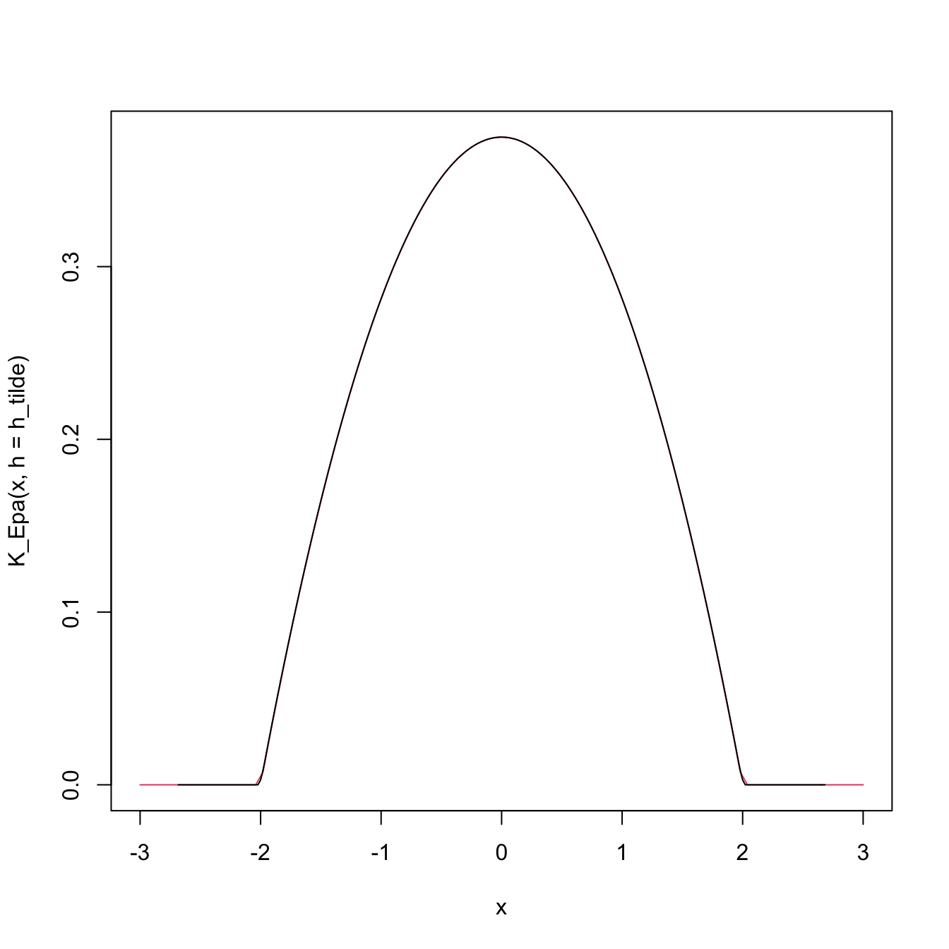curve(K_Epa(x, h = h_tilde), add = TRUE, col = 2)