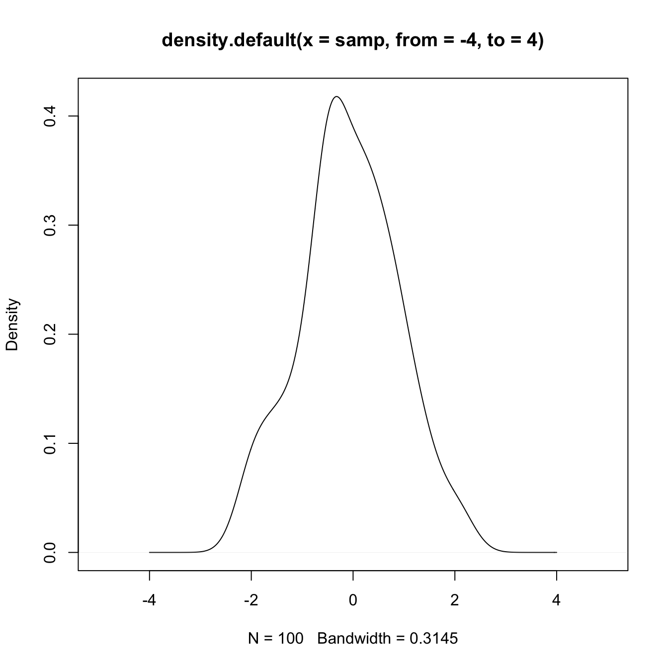 plot(density(x = samp, from = -4, to = 4), xlim = c(-5, 5))