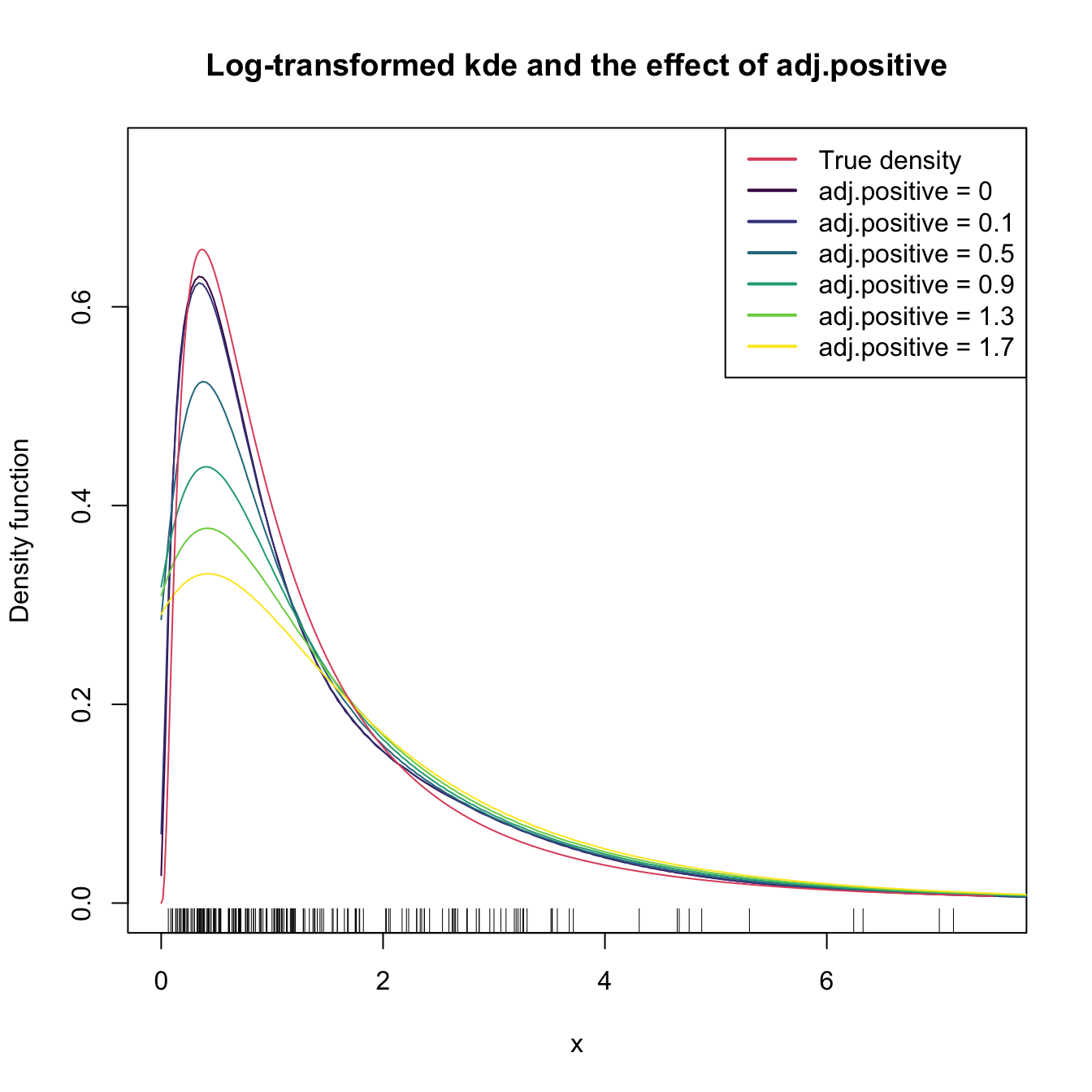 legend("topright", legend = c("True density", paste("adj.positive =", c(0, a))),