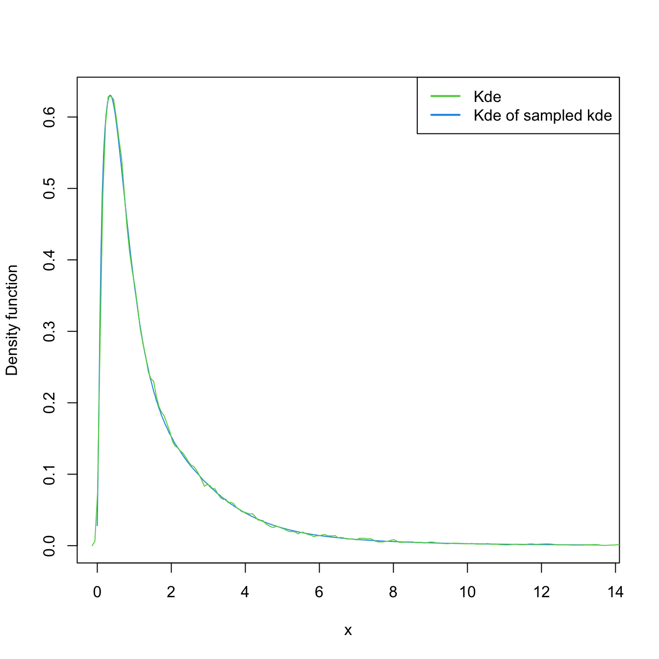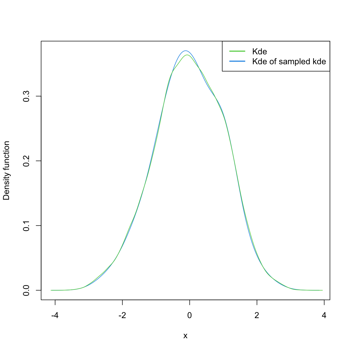 legend("topright", legend = c("Kde", "Kde of sampled kde"),