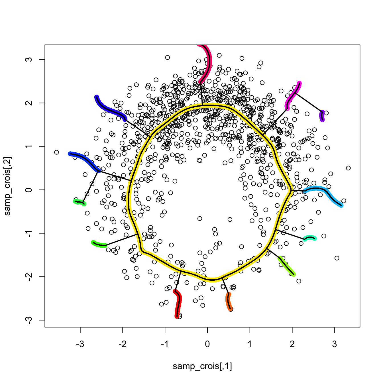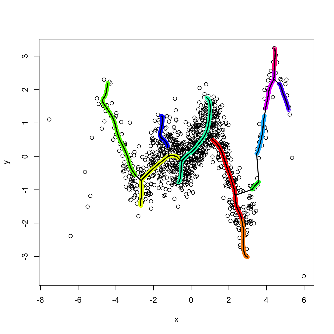Description of the main features of the data. Principal Component Analysis (PCA) is a very well-known linear dimension-reduction technique that is closely related to the normal distribution.82 PCA helps to describe the main features of a dataset by estimating the principal directions on \(\mathbb{R}^p,\) \(p\geq2,\) of the maximum projected variance of \(\mathbf{X}.\) These principal directions are highly related to the density ridges of \(\phi_{\boldsymbol{\Sigma}}(\cdot-\boldsymbol{\mu}),\) the latter concept generating flexible principal curves for any density \(f.\) As a consequence, density ridges of \(\hat{f}(\cdot;\mathbf{H})\) give a flexible nonlinear description of the structure of the data.