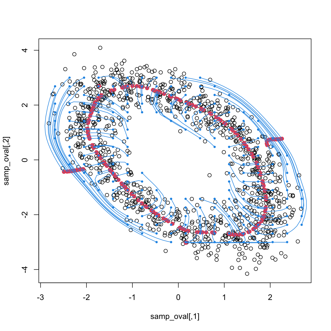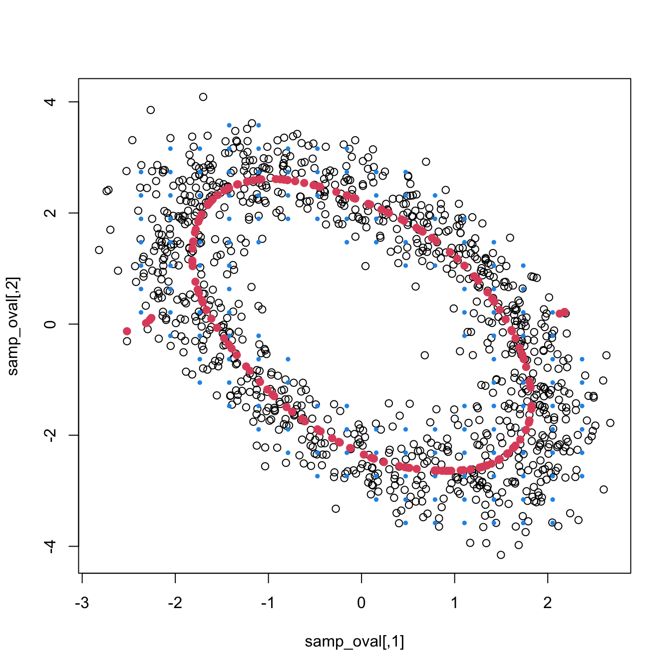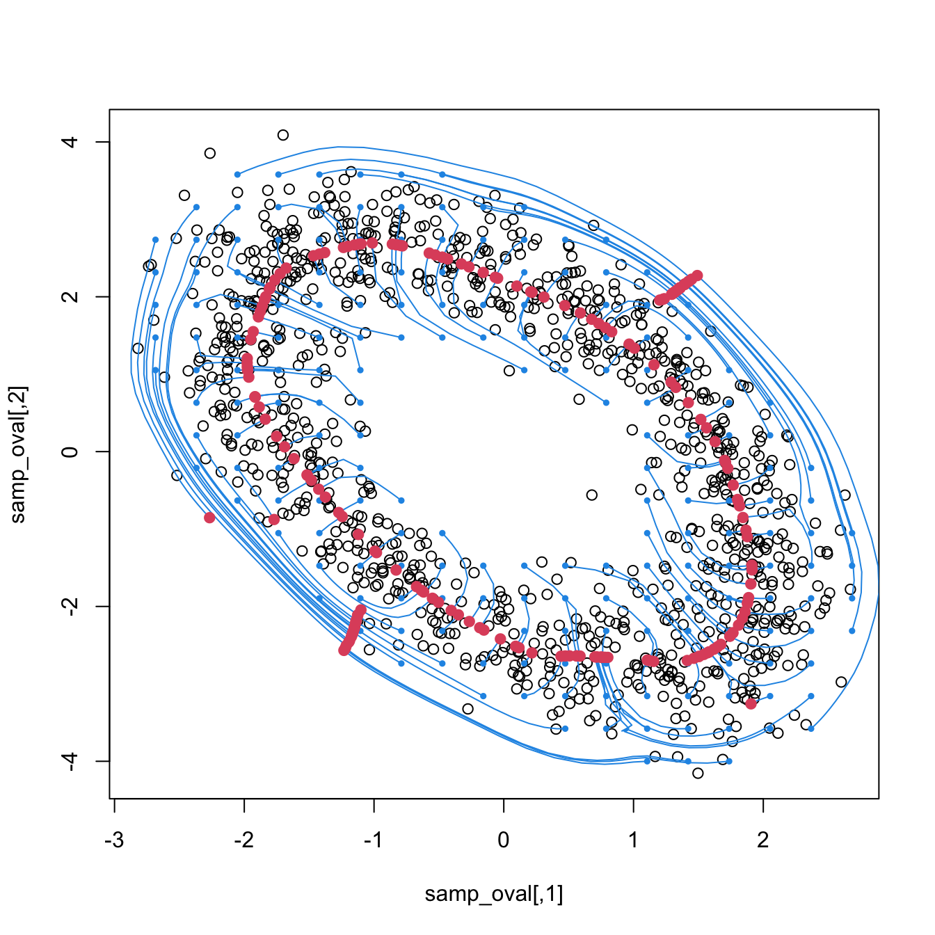 points(kdr_oval_2$end.points[, 1:2], col = 2, pch = 19)