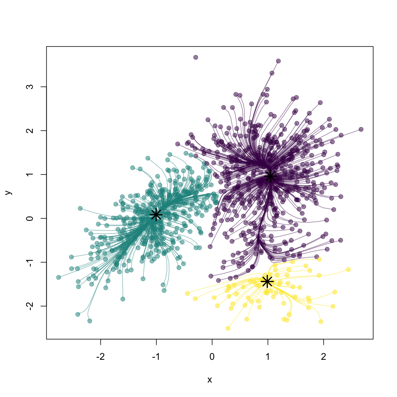 The population view of \(k\)-means is conceptually more involved and less insightful than, as seen subsequently, mode clustering. The latter has an elegant simple connection with the (population) concept of mode.↩︎