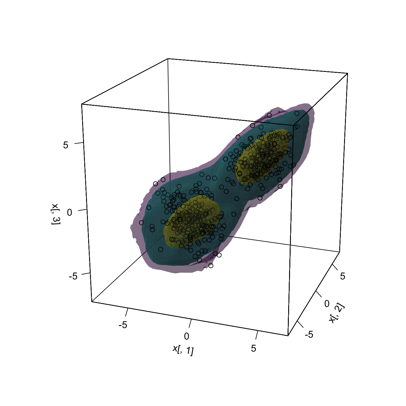 The estimation of the level set \(\mathcal{L}(f;c)=\{\mathbf{x}\in\mathbb{R}^p: f(\mathbf{x})\geq c\},\) useful to determine high-density regions, can be straightforwardly done by plugging the kde of \(f\) and considering